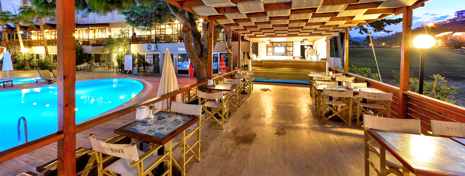 .All Inclusive: snídaně (07:30-10:00), pozdní snídaně (10:00-10:30), oběd (12:30-14:00), večeře (19:00-21:00) navíc, občerstvení během dne (12:00-16:30) a turecké občerstvení (10:30-16:30), káva a čaj, zmrzlina (16:00-17:00), pozdní občerstvení (17:00-18:00), noční polévka (23:00-00:00). Nealkoholické nápoje a místní alkoholické nápoje jsou k dispozici v baru (10:00-24:00). All Inclusive nezahrnuje importované nápoje, čerstvě vymačkané ovocné šťávy, tureckou kávu, konzumaci po 24:00.