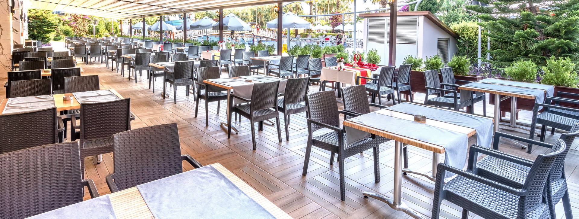 Recepce, prostorná vstupní hala, hlavní restaurace s tureckou a mezinárodní kuchyní, 2 restaurace a'la carte s mořskými plody a italskou kuchyní (po předchozí rezervaci lze využít zdarma jednou za pobyt), 3 bary: lobby bar, plážový bar a snack bar, hlavní bazén nepravidelného tvaru se 3 skluzavkami, dětské brouzdaliště a krytý bazén. Za poplatek: kadeřník, fotograf, prádelna, půjčovna aut a obchod.