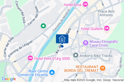 Útulný hotel se nachází v centru Encampu, čtvrté největší vesnice v Andoře, v nadmořské výšce 1300 m. Bezplatná hotelová kyvadlová doprava (zastávka u hotelu) vozí hosty k lyžařské stanici v Grandvaliře (cca 1500 m). V Encampu, který se nachází u vjezdu do Grandvaliry a jen asi 10 minut jízdy od hlavního města Andorry, najdete bary, restaurace a obchody. Transfer na letiště Barcelona trvá přibližně 3,5 hodiny.