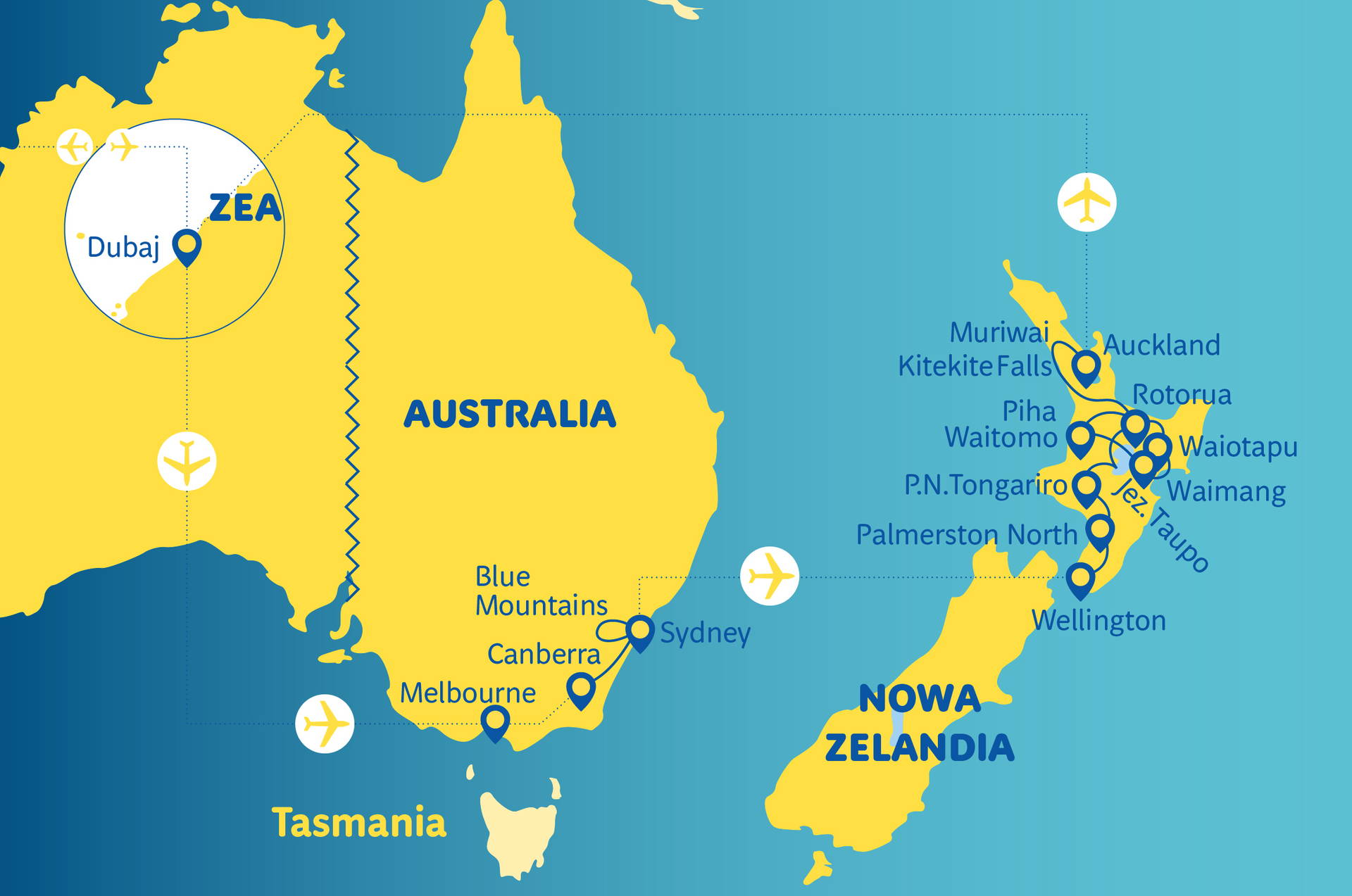 Základní cena zahrnuje: let pravidelnou linkou z Varšavy do Austrálie a z Nového Zélandu do Varšavy s mezipřistáními: Varšava - Melbourne (s přestupem v Dubaji) a Auckland - Varšava (s přestupem v Dubaji); vnitřní přelety na trasách: Melbourne - Canberra, Sydney - Wellington; letištní taxy, přejezdy klimatizovaným autobusem (dle programu), ubytování: 11 nocí (podle programu), stravování: snídaně, služby polského zástupce během odbavení na letišti ve Varšavě, služby polského průvodce nebo polsky mluvícího zástupce místního kontrahenta během poznávací části, turistický program (viz níže), pojištění TU Europa varianta základní (úrazové pojištění a léčebné výlohy, trvalé následky, asistenční služby a pojištění zavazadel).