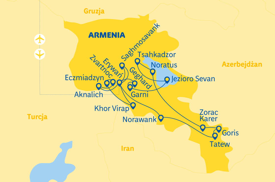 Jerevan - hlavní město Arménie - starší než Řím • panorama vrcholků Araratu • Kaskáda - galerie pod širým nebem • Matenadaran - muzeum rukopisů • ochutnávka arménské brandy • Geghard (UNESCO) - „klášter kopí“ - vytesaný do skály • plavba po jezeře Sevan (fakultativně) • „Černý klášter“ nad smaragdem Arménie • hřbitov chačkarů • Tatev - klášter nad propastí • nejdelší lanovka - nad roklí řeky Vorotan • Zorac Karer - „arménský Stonehenge“ • Ečmiadzin - nejstarší katedrála na světě • Chor Virap - klášter s výhledem na hory Ararat