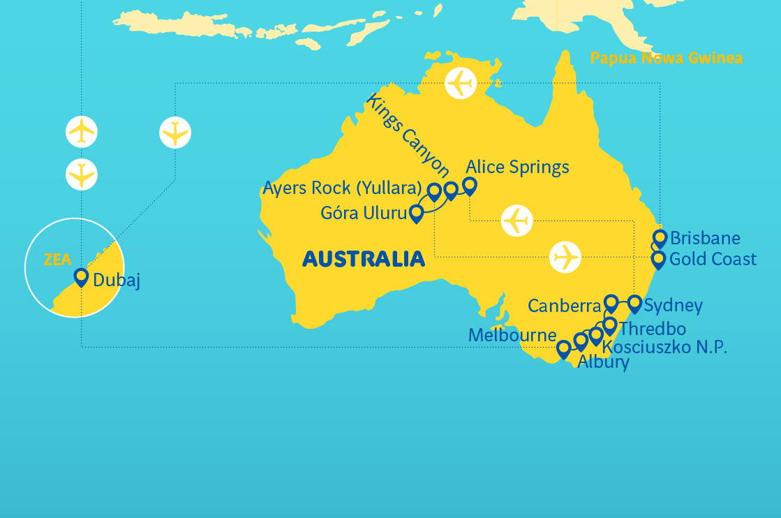 Základní cena zahrnuje: let pravidelnou linkou z Varšavy do Austrálie a z Austrálie do Varšavy s mezipřistáními: Varšava - Dubaj (nocleh a prohlídka) - Melbourne a Brisbane - Varšava, vnitřní přelety na trasách: Melbourne - Alice Springs; Ayers Rock - Sydney, Sydney - Gold Coast; letištní taxy, přejezdy klimatizovaným autobusem (dle programu), ubytování: 12 nocí (podle programu), stravování: snídaně, služby polského zástupce během odbavení na letišti ve Varšavě, služby polského průvodce nebo polsky mluvícího zástupce místního kontrahenta během poznávací části, turistický program (viz níže), pojištění TU Europa varianta základní (úrazové pojištění a léčebné výlohy, trvalé následky, asistenční služby a pojištění zavazadel).