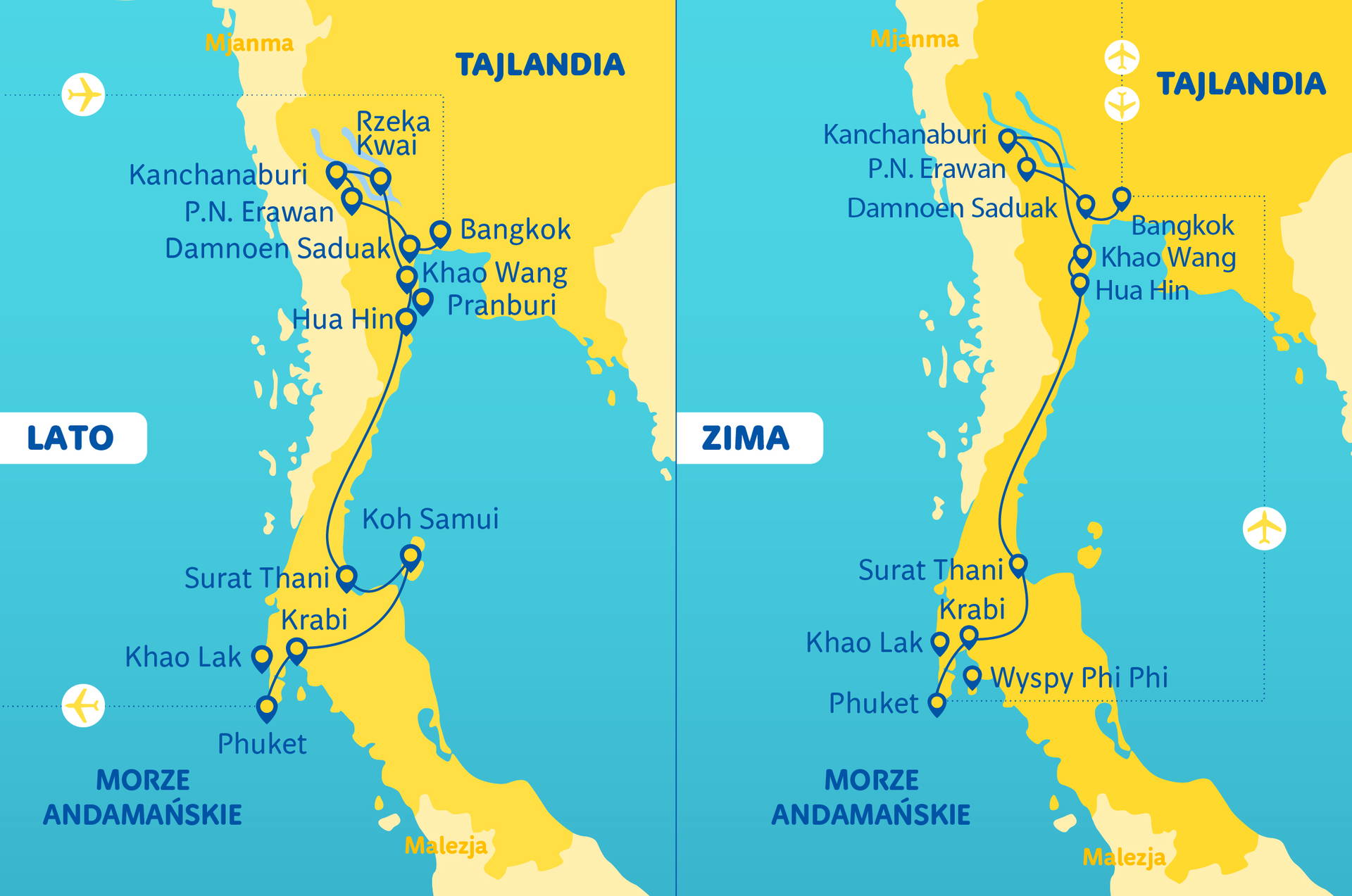Základní cena zahrnuje: přelet charterovým letadlem společnosti LOT (přímý let) do Bangkoku a z Bangkoku do Polska, přelet místními leteckými linkami na trase: Phuket - Bangkok, letištní taxy, ubytování v hotelech (14 nocí), transfery klimatizovaným autokarem na území Thajska, stravování dle programu (14 snídaní, 2 lunche/obědy, 5 večeří), služby polského zástupce během odbavení na letišti v Polsku, služby polského průvodce během prohlídek, turistický program (viz níže), pojištění TU Europa varianta základní (úrazové pojištění a léčebné výlohy, trvalé následky, asistenční služby a pojištění zavazadel).