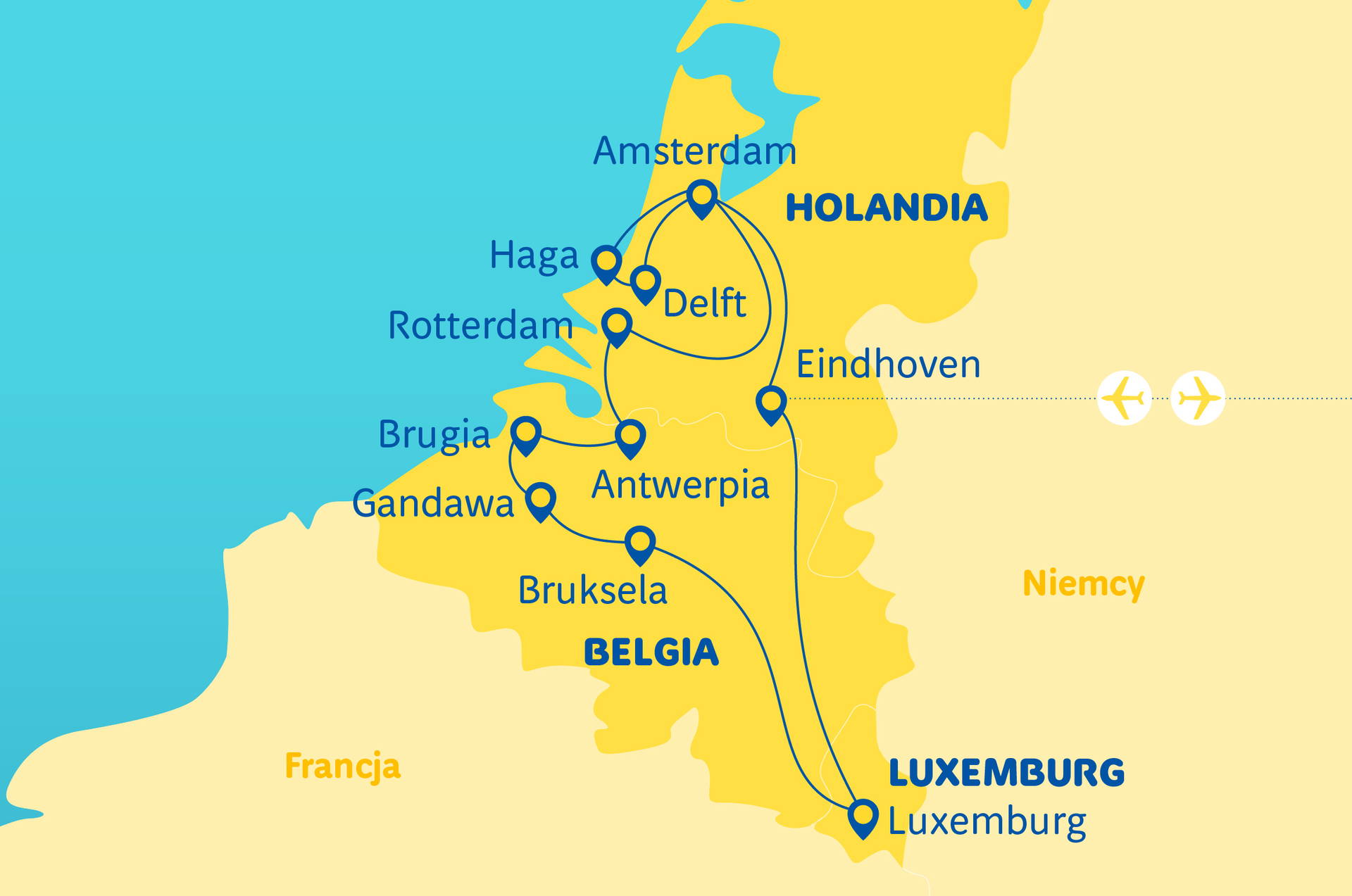 Maastricht - nejstarší nizozemské město a symbol Evropské unie • Lucembursko - místo, kde se setkává minulost s budoucností • Bruggy, Gent - středověká dobrodružství • Amsterdam - úžasná lehkost bytí a nádherná díla Rembrandta • plavba po amsterdamských kanálech • hráz Maeslantkering u Severního moře • větrné mlýny u Kinderdijku • Rotterdam - největší přístav na světě • Aalsmeer - největší květinová burza na světě • Haag - centrum nizozemské politiky