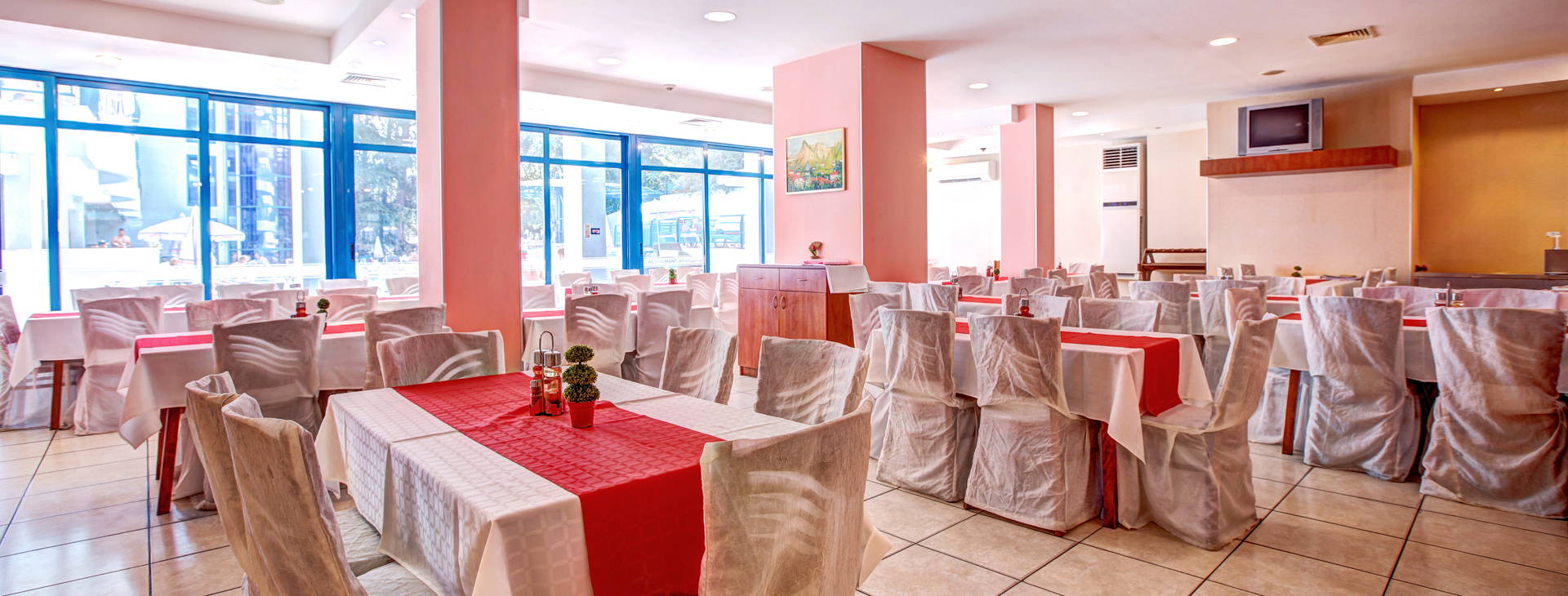 All inclusive: snídaně (7:30-10:00), oběd (12:00-14:00) a večeře (18:00-20:30) formou bufetu. Občerstvení od 16:00-17:00 v hlavní restauraci. Místní alkoholické nápoje: vodka, rum, gin, whisky, víno, pivo a nealkoholické nápoje: Mirinda, 7up, Tonic, džusy, káva, čaj a minerální voda podávané v hlavním baru od 18:00-22:30, v baru u bazénu (11:00-18:00) a v Skybaru (14:00-22:30) umístěném na střeše budovy.