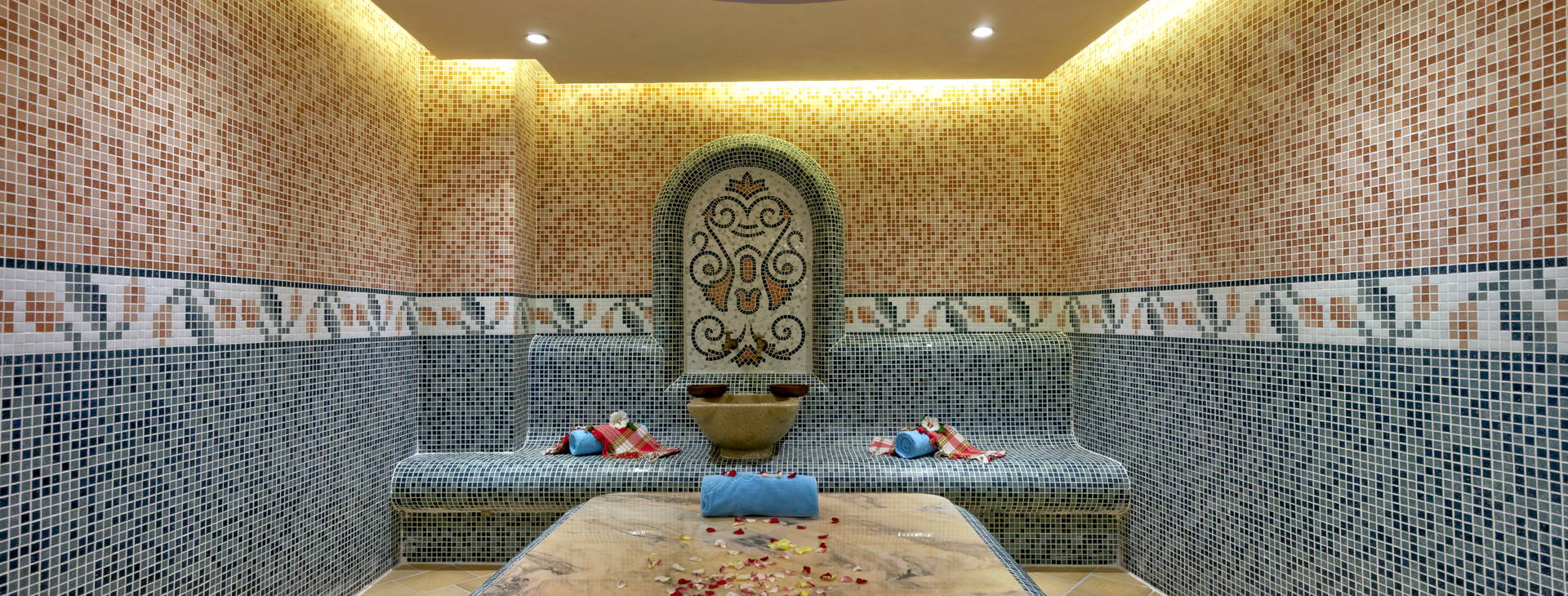 V sedmipatrové budově se nachází recepce s nepřetržitým provozem, 2 výtahy, obchod, směnárna, hlavní restaurace, restaurace s občerstvením a restaurace à la carte "Chef's Restaurant" (1 návštěva za minimálně 7 dní pobytu zdarma, nutná rezervace), lobby bar "Atrium" a bar u bazénu, velký dvouúrovňový bazén (lehátka a slunečníky zdarma) a oddělený dětský bazén, jakož i wellness centrum (za příplatek) zahrnující: krytý bazén, vířivku, parní lázeň, hammam, masáže.Patří sem: krytý bazén, vířivka, parní lázeň, hammam, masáže.