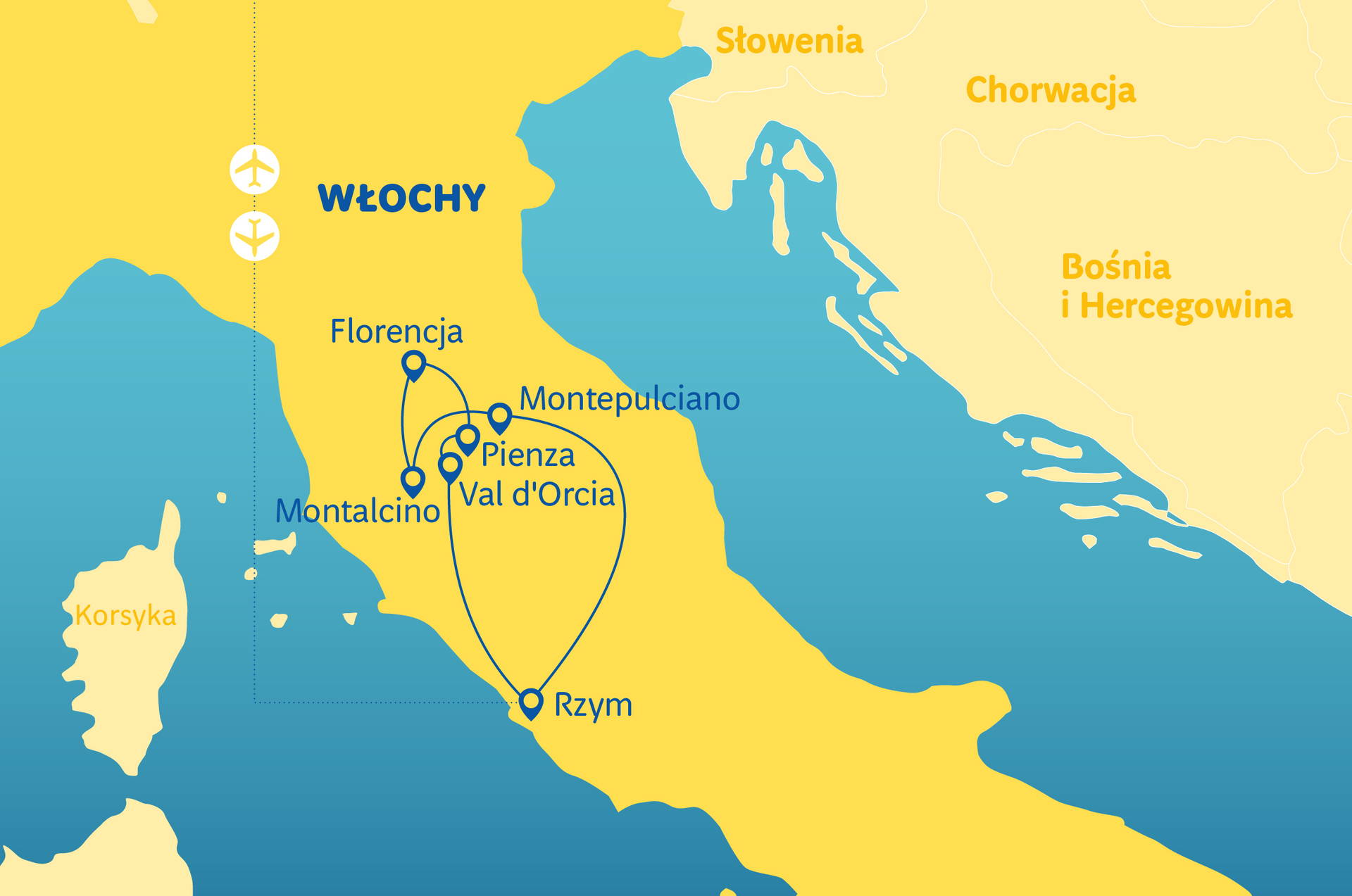 Sraz na letišti F. Chopina ve Varšavě, u stanoviště Rainbow 2 hodiny před plánovaným odletem letadla. Aktuální letové řády sledujte na R.pl/rozklady. Přílet do Říma, transfer do hotelu v Chianciano Terme. Ubytování, volný čas, večeře. (Trasa cca 200 km)