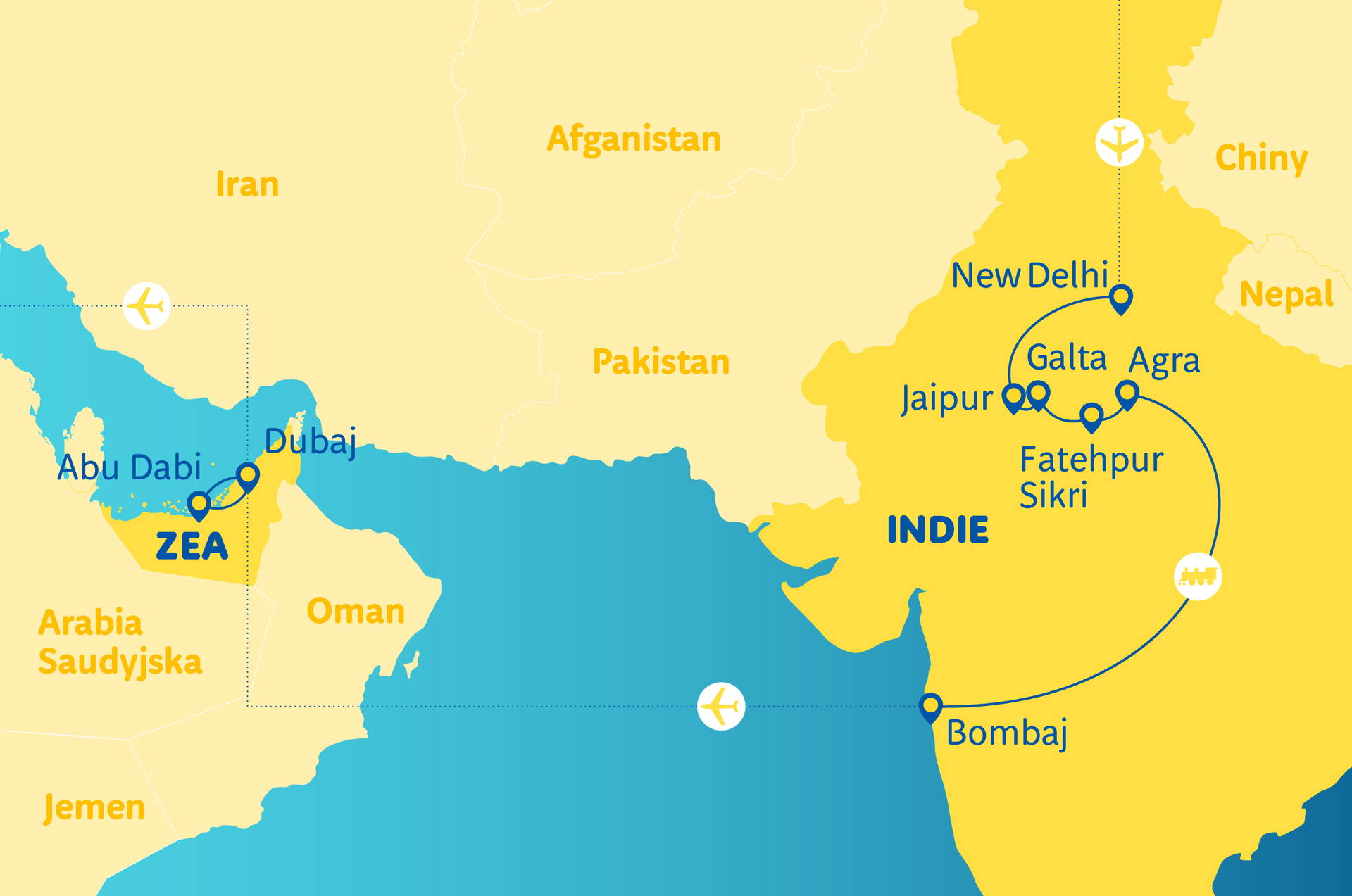 Dillí a Brána Indie (India Gate) • Džajpur a pevnost Amber • opice a chrámy v Galtě • mauzoleum Tádž Mahál • architektonický komplex Fatehpur Sikrí (ze seznamu UNESCO • Bombaj - hlavní město Bollywoodu • u Perského zálivu - bohatství Dubaje a Abu Dhabi
