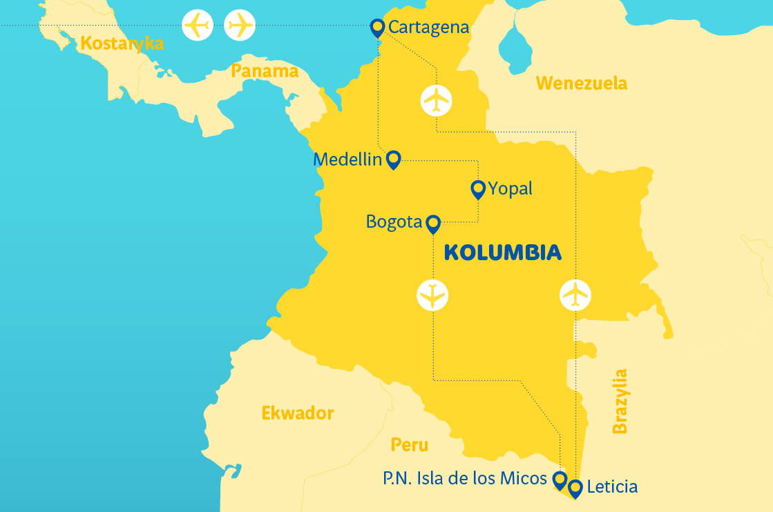Medellín - po stopách Pabla Escobara - nejkrásnější koloniální město světa Cartagena - kolumbijští kovbojové llaneros - kapybary, želvy, kajmani, mravenečníci - Bogotá - opravdový zážitek - Leticia - srdce amazonské džungle na hranicích Kolumbie, Brazílie a Peru - opice, růžoví delfíni a lenochodi - relaxace u Karibského moře