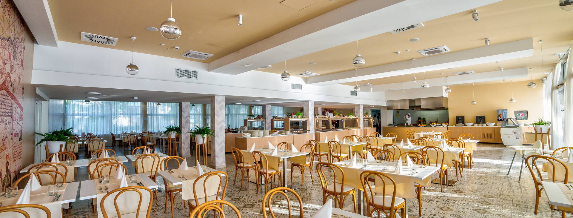 Polopenze: snídaně a večeře formou bufetu, nealkoholické a místní alkoholické nápoje (pivo a víno) u oběda a večeře. K dispozici vegetariánské menu a menu pro osoby s dietními požadavky.