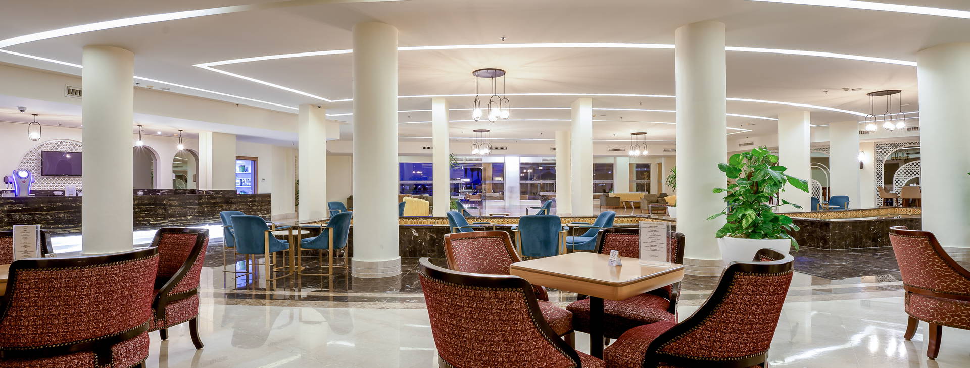 All Inclusive: časná snídaně (05:00-07:00), snídaně (07:00-10:00), oběd (12:30-14:30), večeře (18:30-21:30), pozdní večeře (21:00-00:00), podávané formou bufetu v hlavní restauraci. Občerstvení ve food court baru (12:30-17:00). Bezplatné místní nealkoholické a alkoholické nápoje se podávají v určených barech od 10:00-24:00. All inclusive nezahrnuje čerstvé ovocné šťávy, nápoje v lahvích a produkty z minibaru. Hotel si vyhrazuje právo na změnu rozsahu služeb zahrnutých do formule all inclusive (např. časy podávání).
