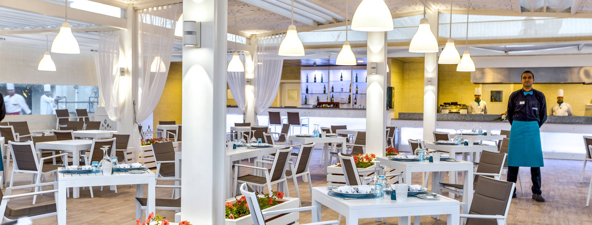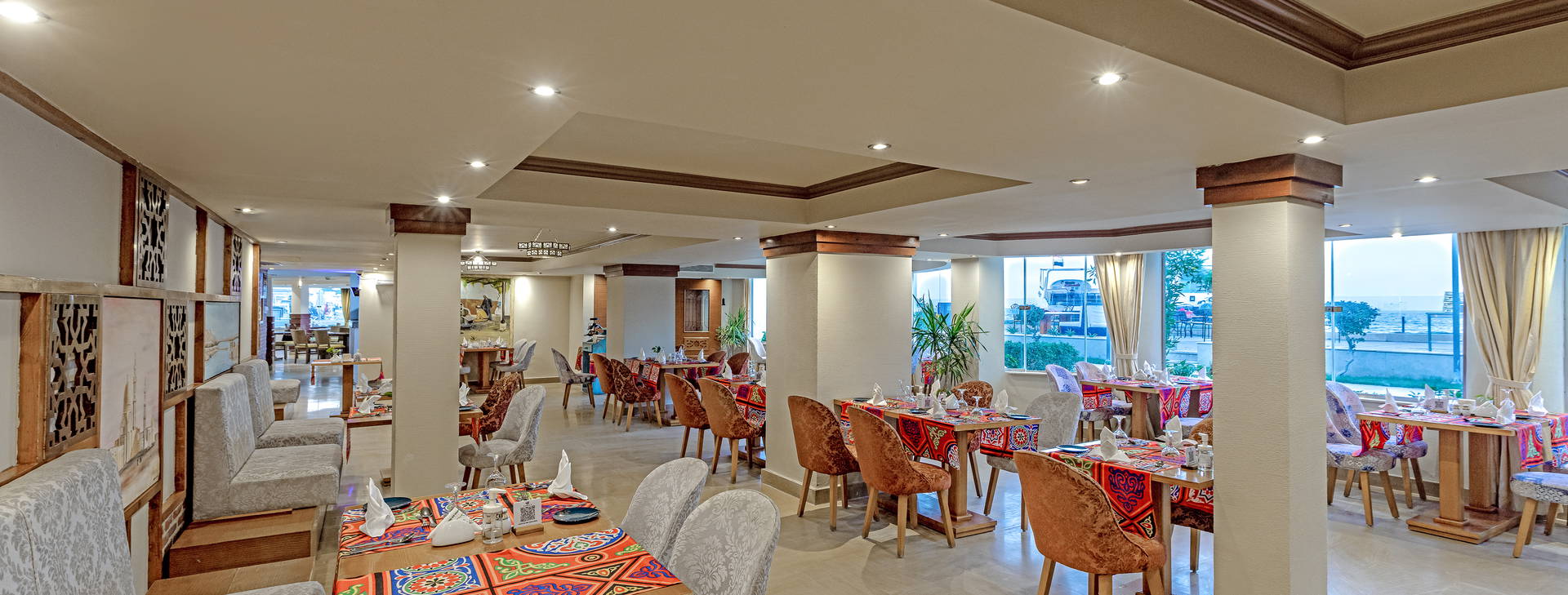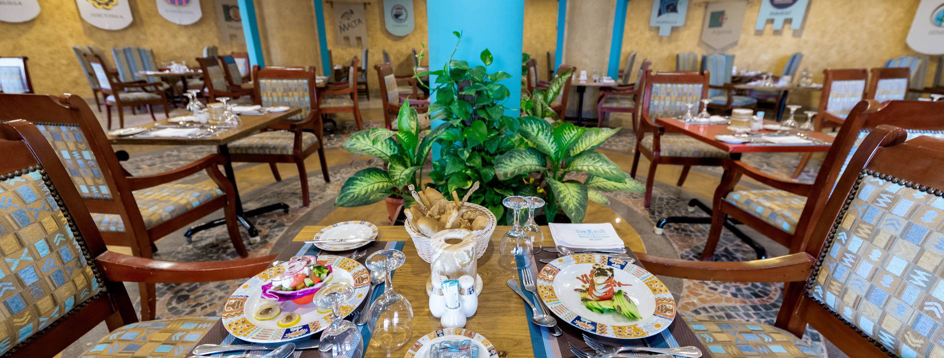 Stravování formou bufetu v hlavní restauraci El Sol: snídaně 07:00-10:30, pozdní snídaně 10:30-11:00, oběd 12:30-15:00, večeře 18:30-22:00, pozdní jídlo 22:00-01:00. Občerstvení 12:00-17:00 podávané v restauraci Nasaya, odpolední čaj 15:00-17:00 v lobby baru.