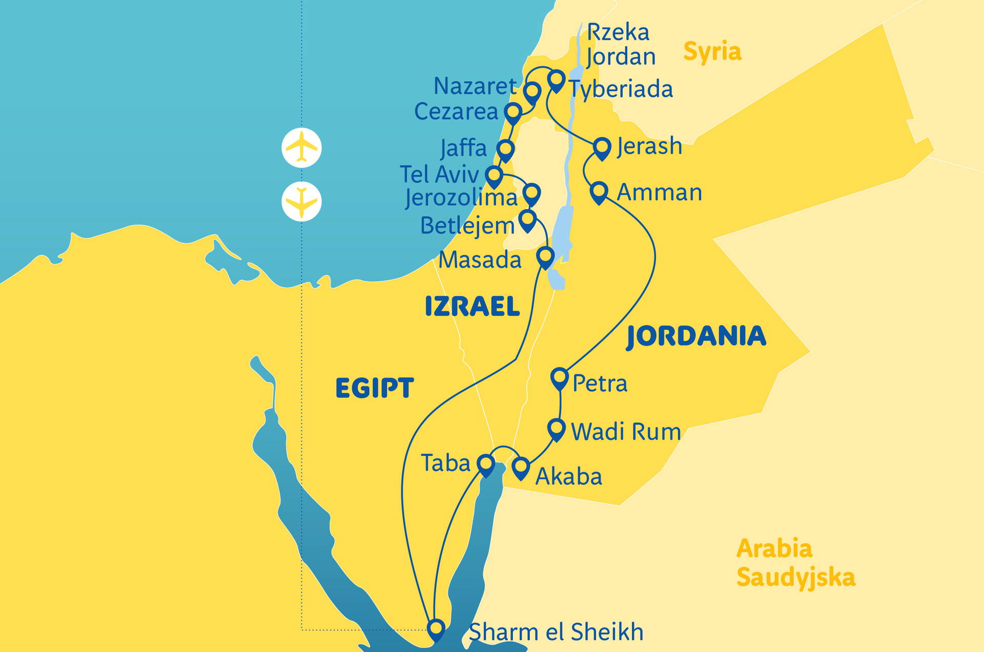 Sharm el Sheikh - Sinajské letovisko - Wadi Rum - Královna pouští - Petra - Hora Nebo - Poslední Mojžíšův pohled - Betlém - Jerash - Město 600 sloupů - Řeka Jordán - Galilejské jezero - Cesarejské jezero - Jaffa-Tel Aviv - Jeruzalém - fakultativně týdenní pobyt v Šarm aš-Šajchu.