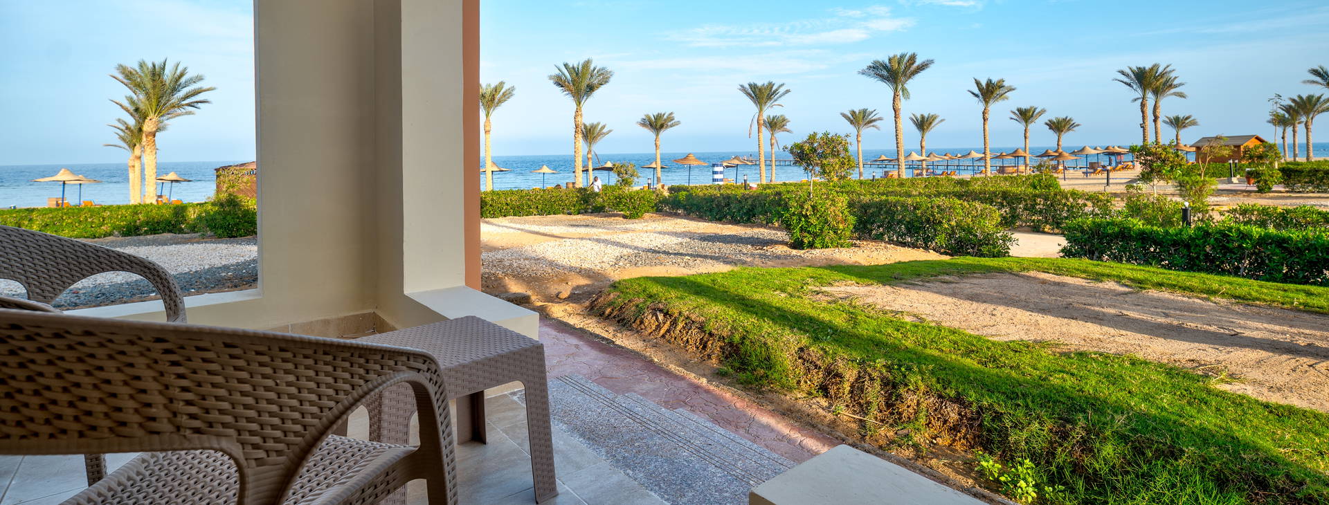 Přímo u hotelu (cca 100 m) je soukromá písečná pláž s přístupem ke korálovému útesu přes molo. Osušky, lehátka a slunečníky na pláži a u bazénu - zdarma.