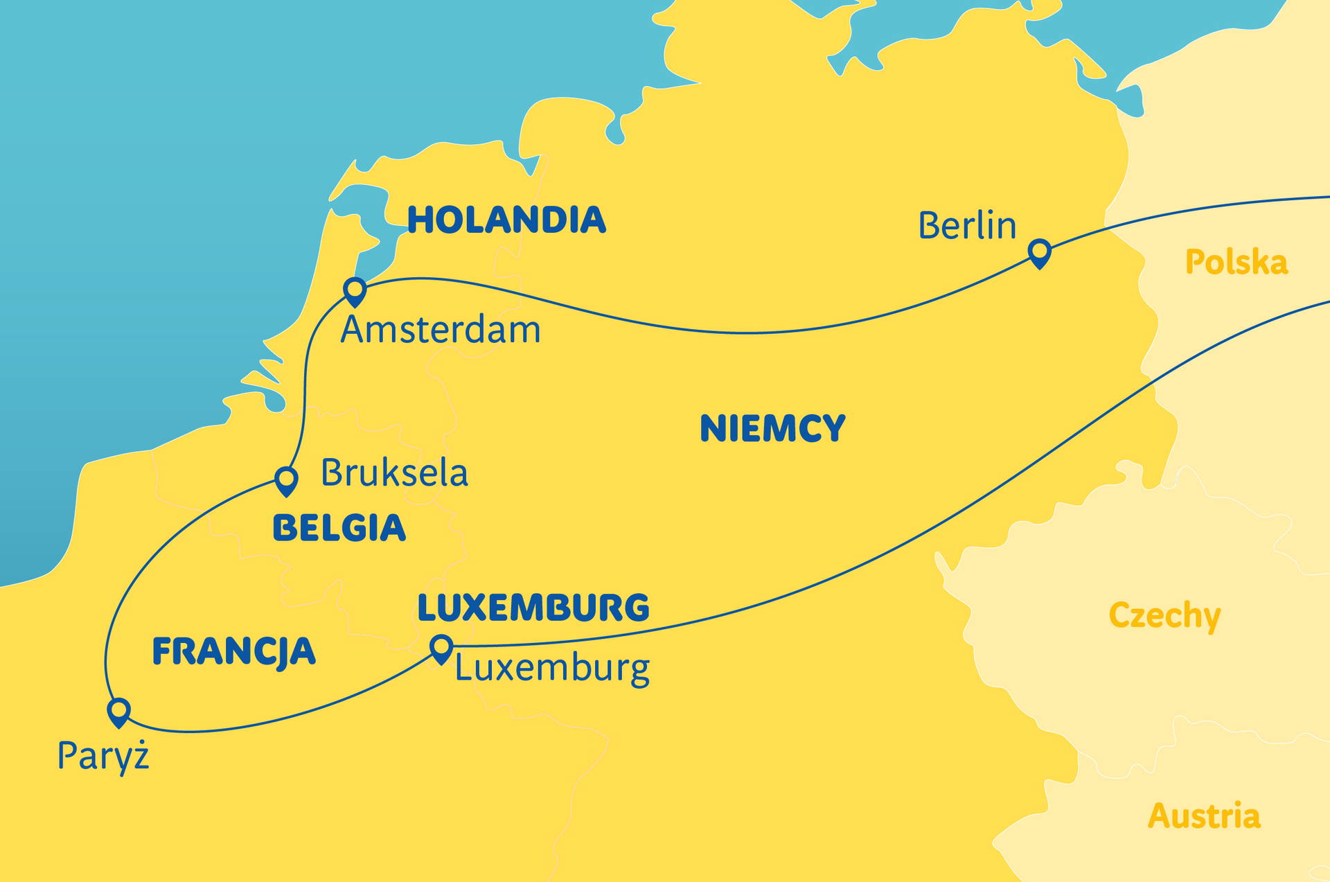 Berlín - východ a západ znovu spolu • Amsterdam - kanály, kola a úžasná lehkost bytí • Brusel - čokoláda a pivo v krajce • Paříž - šmrnc a elegance • Lucembursko - sama zelená, čili „zelené srdce Evropy“ • tranzitní ubytování v ceně