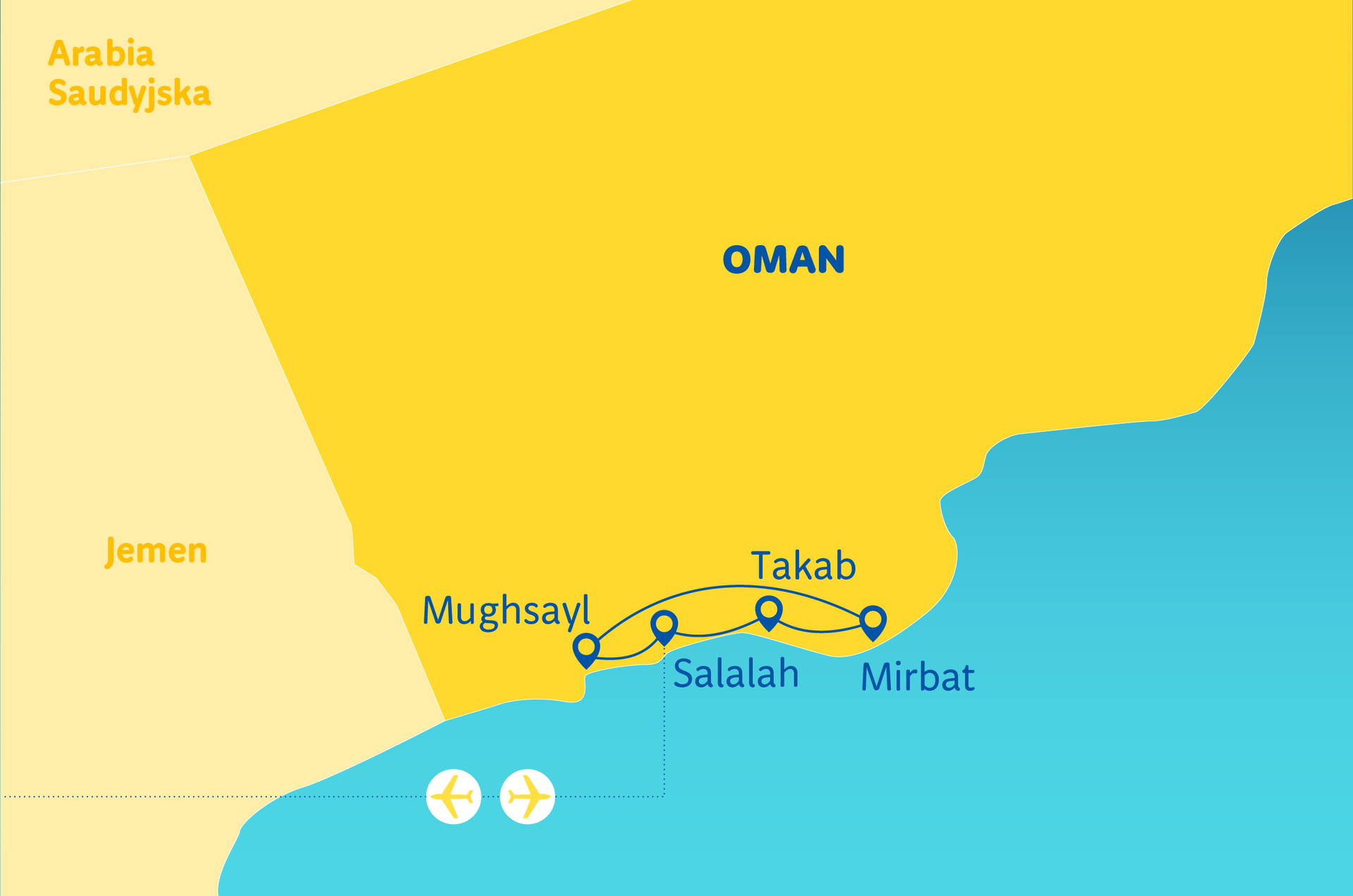 Shromážděte se na letišti u odbavovacích přepážek Rainbow 2 hodiny před odletem. Aktuální letové řády najdete na R.pl/schedules. Let do Ománu (letiště Salalah, možné mezipřistání). Po příletu celní a pasové odbavení a transfer do hotelu v Salalahu. Ubytování a přenocování v hotelu v Salalahu nebo okolí. (V tento den se nekoná fakultativní večeře)