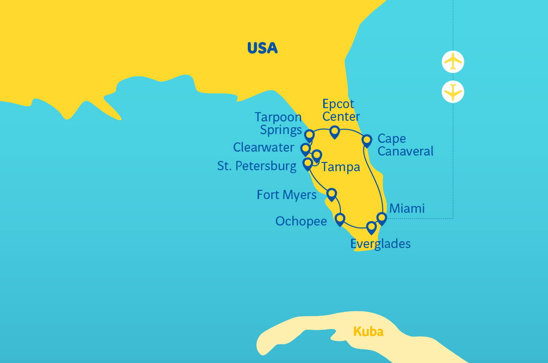 - Miami - nejkrásnější pláže Floridy - kachní loď na South Beach - Star Island - sídla hvězd - St. Petersburg - sbírka Salvadora Dalího - Epcot Center - zábavní park v Orlandu - zábava pro malé i velké - mys Canaveral a základna NASA - Everglades - moře trávy