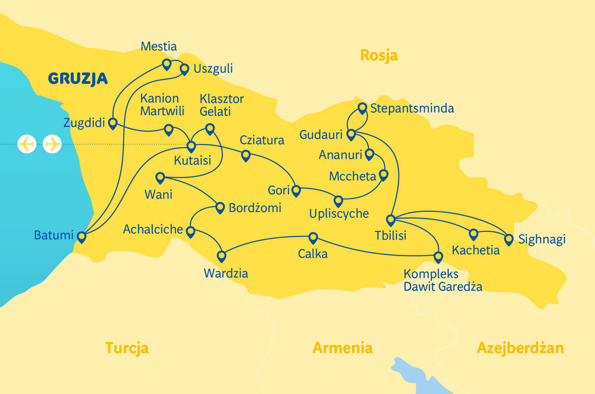 Kutaisi (seznam UNESCO) – město prodchnuté historií • Uplisciche – skalní město • Mccheta – náboženské hlavní město Gruzie • Cesta po Gruzínské válečné stezce • Tbilisi – kulturní tavící kotlík • Kachetie – země vína • komplex Davit Gareža – mistrovské dílo středověké gruzínské architektury • Vardzia – klášter vytesaný do skály • Borjomi – „alpské lázně” • kaňon Martvili • Batumi – černomořské letovisko • odpočinek v hotelu