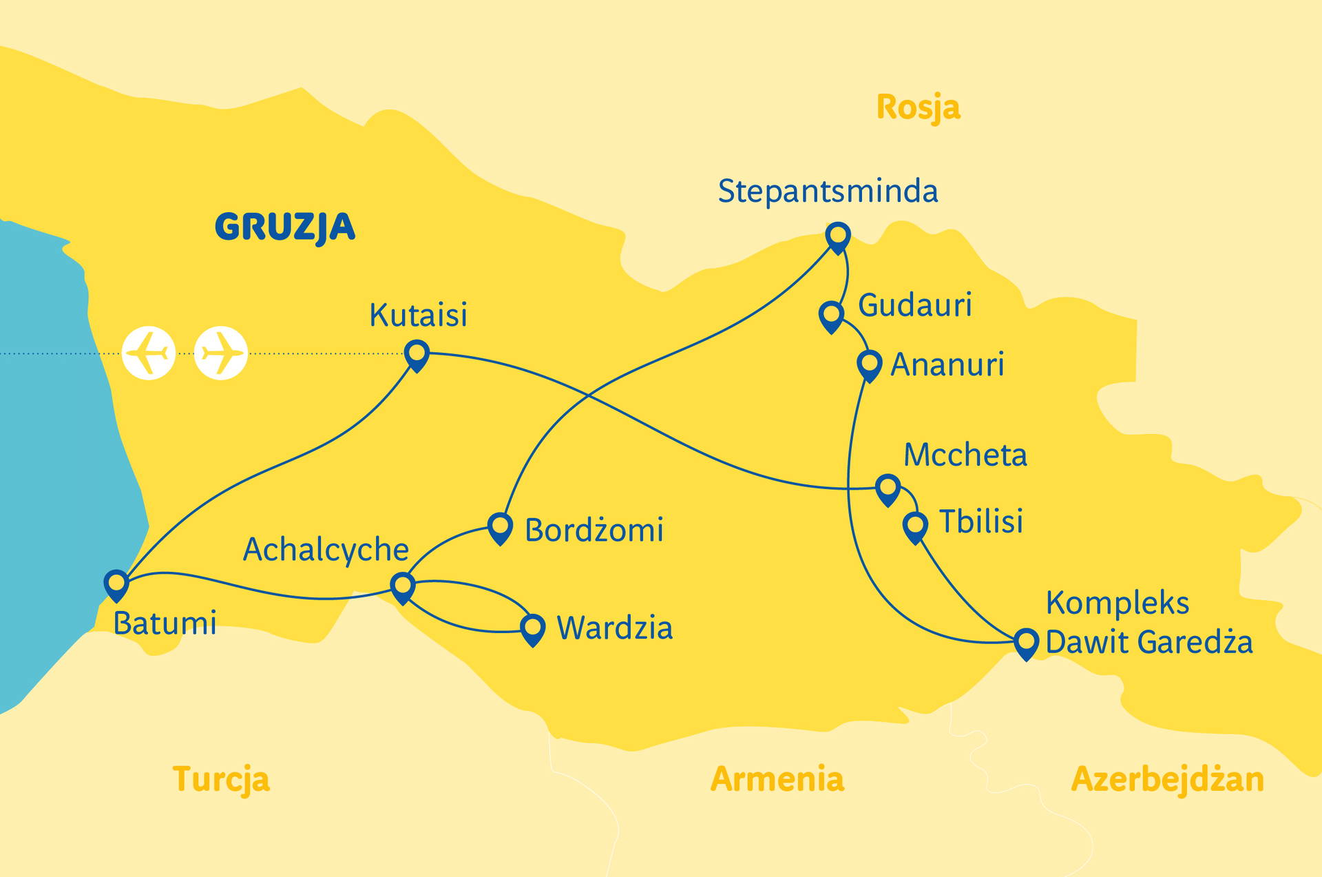 Batumi – černomořské letovisko • Kutaisi (seznam UNESCO) • Tbilisi – kulturní tavící kotlík • Brandy továrna Sarajishvili • Komplex Davit Gareja – architektonické skvosty Gruzie • Cesta po Gruzínské vojenské silnici • Mtskheta – náboženské hlavní město Gruzie • Vardzia – klášter vytesaný do skály • Borjomi – „alpské lázeňské město”