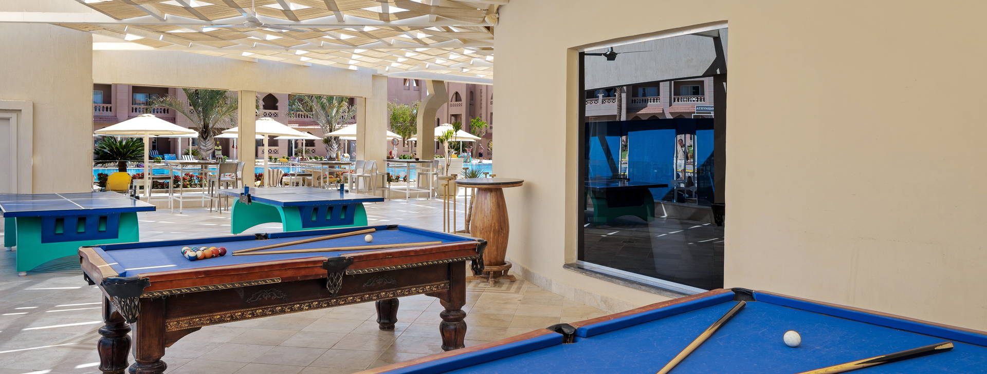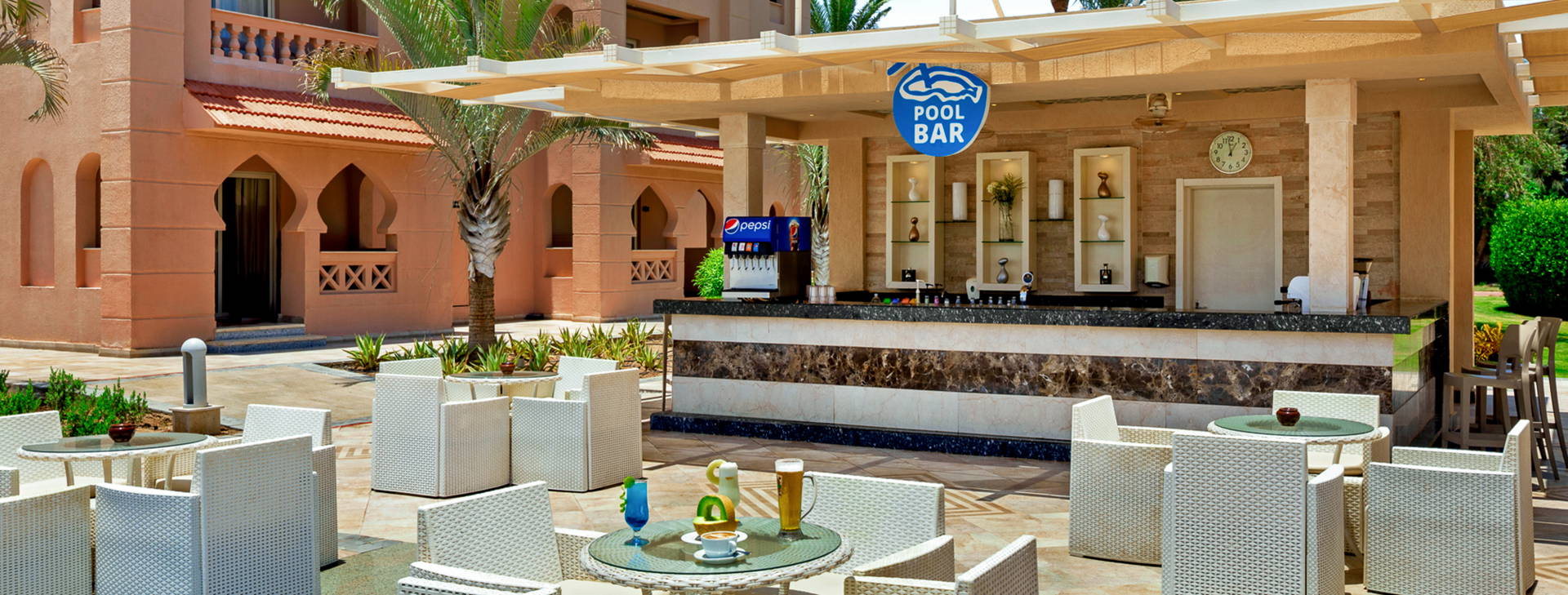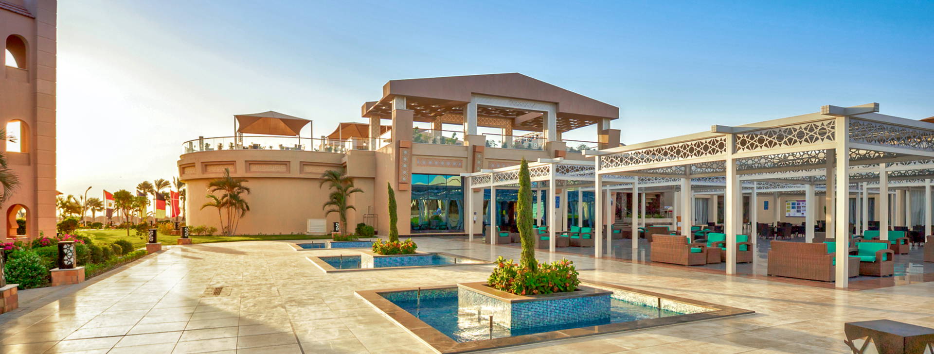 V hotelu je nepřetržitě otevřená recepce, vstupní hala, úschovna zavazadel, bankomat se směnárnou, obchody se suvenýry, kadeřnické a kosmetické služby a prádelna (za příplatek). V hotelu je hlavní restaurace, 2 tematické restaurace s italskou a asijskou kuchyní a několik barů: u bazénu, lobby bar a Irish Pub a diskotéka. K dispozici je také plážový bar v hotelu Beach Albatros. Hosté mohou využívat 3 rozsáhlé venkovní bazény (včetně 1 vyhřívaného v zimní sezóně) se 4 skluzavkami, včetně bazénu s umělými vlnami a dětského brouzdaliště s atrakcemi pro nejmenší, obklopené sluneční terasou. Lehátka, matrace, slunečníky a osušky u bazénů - zdarma.