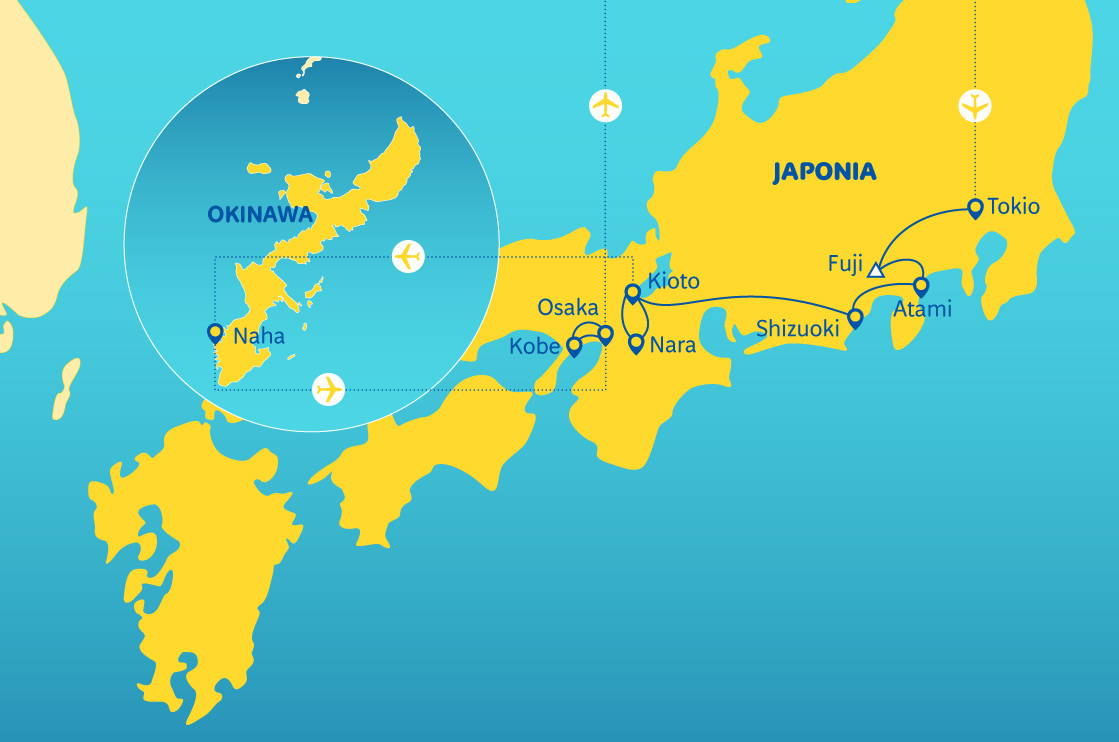 Tokio – tradice a modernita • hora Fudži • Nara • Zlatý pavilon a čtvrť gejš v Kjótu • odpočinek na plážích Okinawy • návštěva továrny na saké • futuristická Ósaka