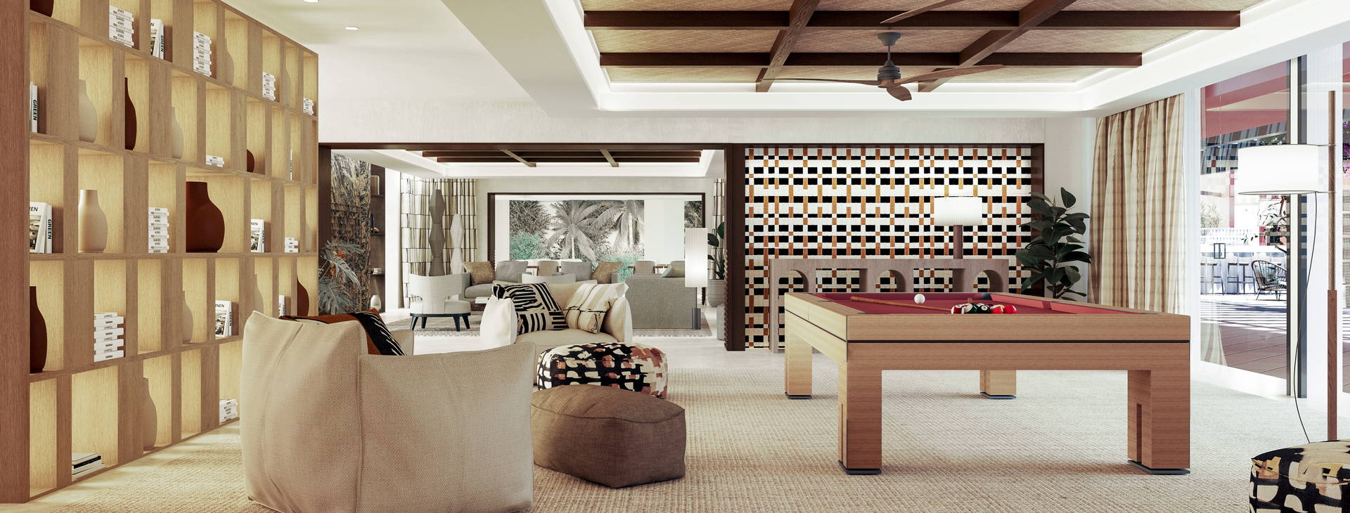 Recepce, vstupní hala, 3 bazény (včetně jednoho pouze pro dospělé), vířivka, 4 restaurace, 4 bary, čajovna, posilovna otevřená 24 hodin denně, subtropická zahrada.