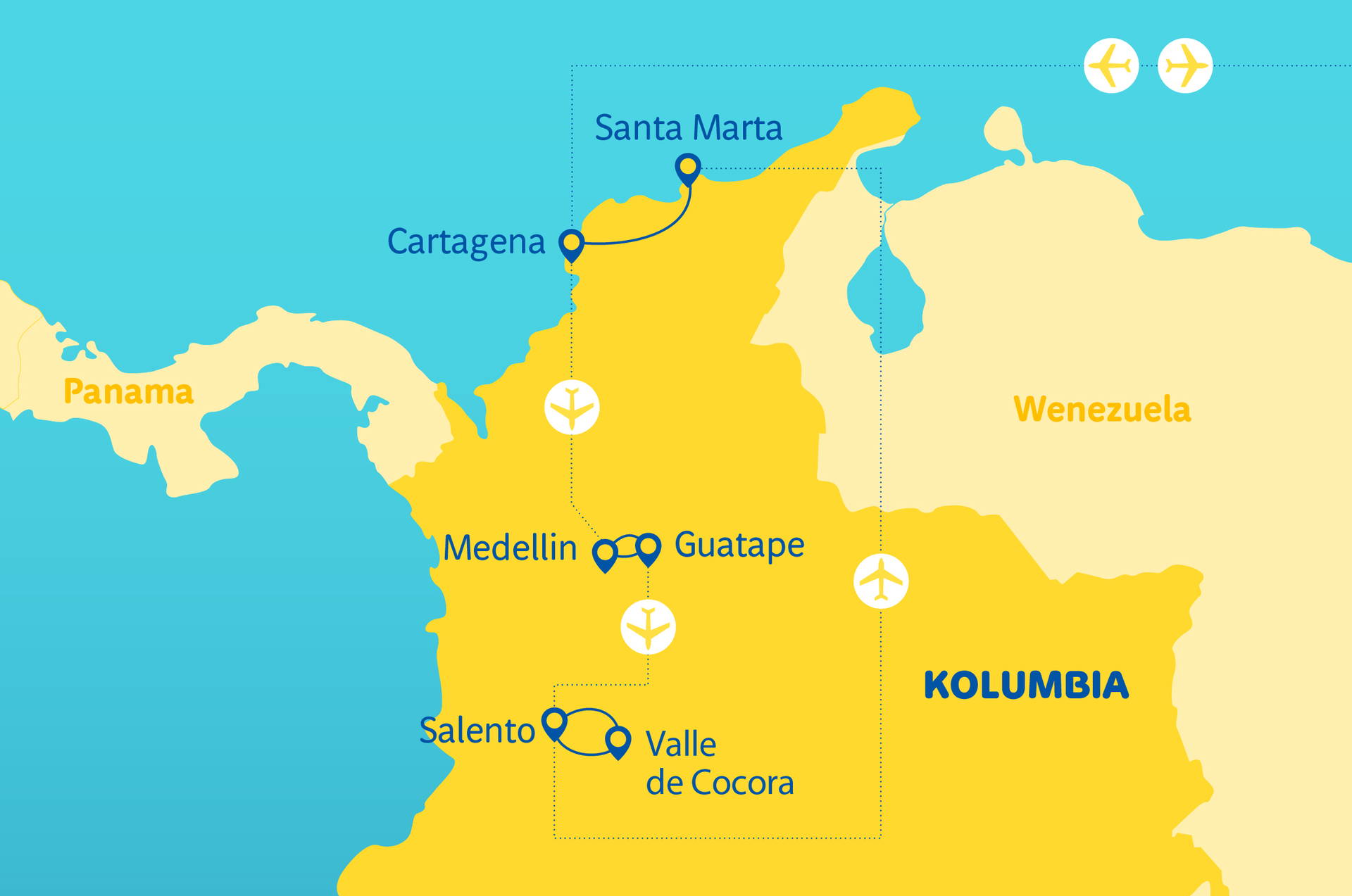 Koloniální Cartagena de Indias - moderní Medellín - po stopách Pabla Escobara - Guatape - nejfotogeničtější město Kolumbie - nejvyšší palmy světa - symbol Kolumbie - kouzelné údolí Cocora - džungle v parku Tayrona - Santa Marta - nejstarší koloniální město Kolumbie - indiáni - odpočinek u Karibského moře.