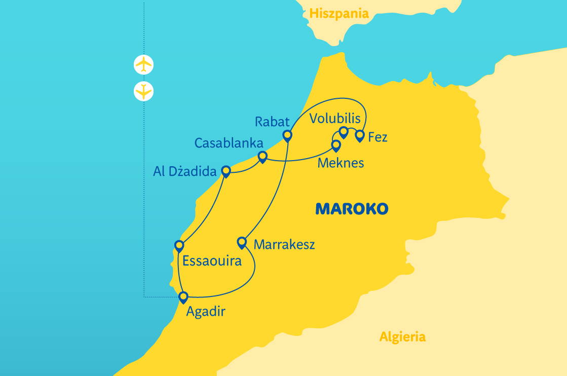 Základní cena zahrnuje: přelet charterovým letadlem na vybrané trase, letištní taxy, transfery klimatizovaným autokarem v Maroku, ubytování: 7 nocí v 3* nebo 4* hotelech, stravování: 7 snídaní a 7 večeří, služby polského zástupce během odbavení na letišti, služby polského průvodce během poznávací části, pojištění TU Europa varianta základní (úrazové pojištění a léčebné výlohy, trvalé následky, asistenční služby a pojištění zavazadel).