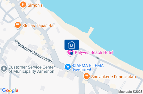 Hotel se nachází v malé vesničce Kalives, asi 20 km od centra Chanie (autobusová zastávka 100 m, jízdní řády k dispozici na recepci) a asi 30 km od letiště. Přímo u hotelu se nachází ústí řeky Xydas do moře, což dodává místu další kouzlo. V okolí je dobrý výběr taveren, supermarketů a služeb.