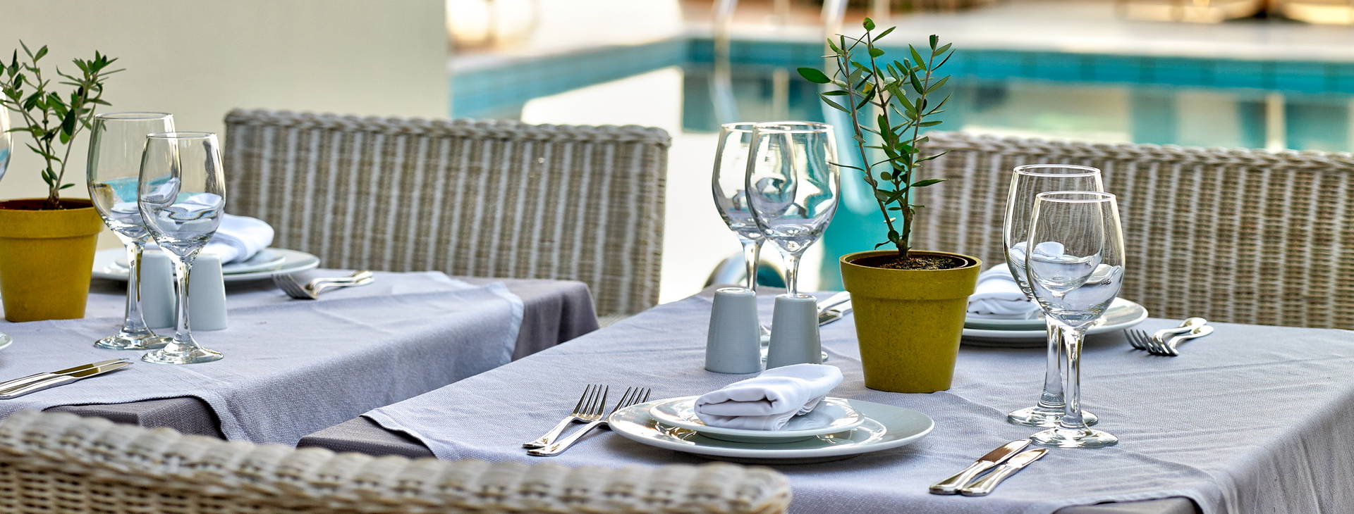 Snídaně (7:30-10:00) a večeře (19:00-21:00) formou bohatého bufetu. K dispozici jsou polévky, teplé a studené občerstvení, široký výběr salátů a zeleniny, hlavní jídla, show cooking a řecký koutek s místními specialitami. Obědy jsou za příplatek. Nealkoholické nápoje a místní alkoholické nápoje se podávají v baru (10:00-24:00).