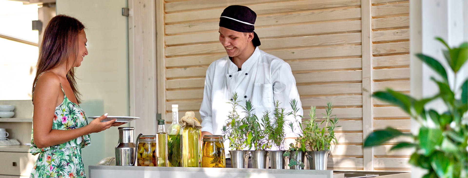 Snídaně (7:30-10:00) a večeře (19:00-21:30) formou bohatého bufetu, který zahrnuje místní i mezinárodní pokrmy. Každý den čerstvé ovoce a zelenina, polévky, teplé a studené občerstvení, různé saláty a hlavní jídla. Každý den jiné menu, představující místní speciality, připravované rovněž v ukázkové kuchyni. Možnost příplatku za oběd. Nealkoholické nápoje a místní alkoholické nápoje podávané v baru (10:00-24:00).