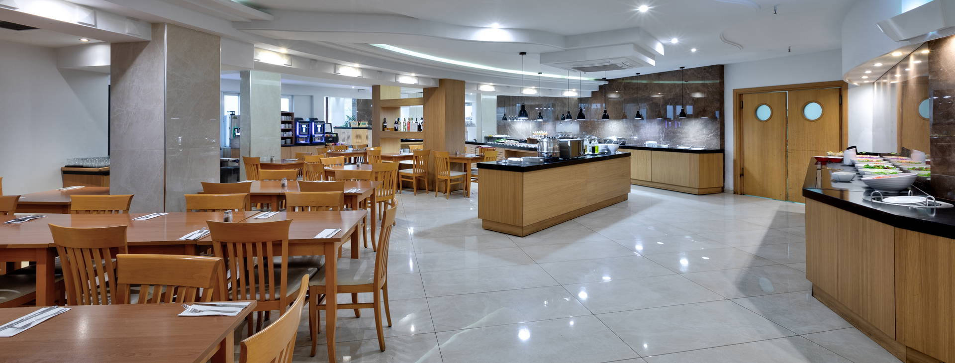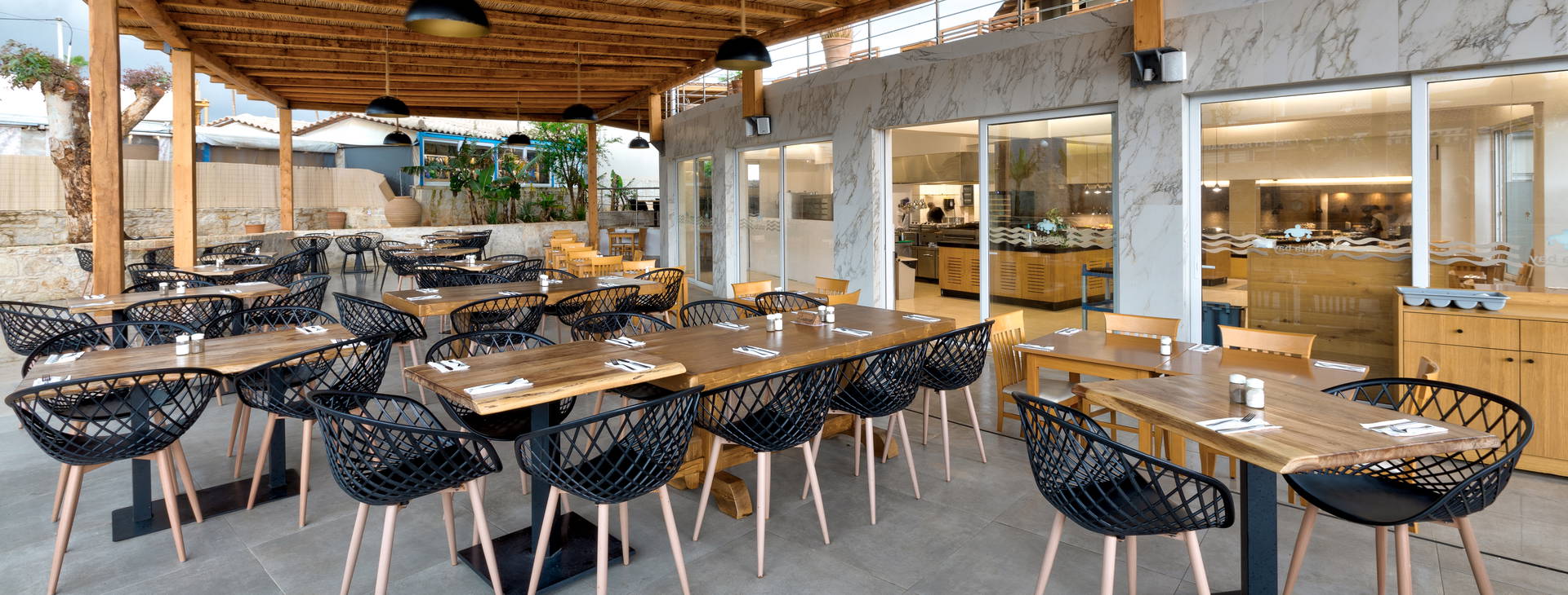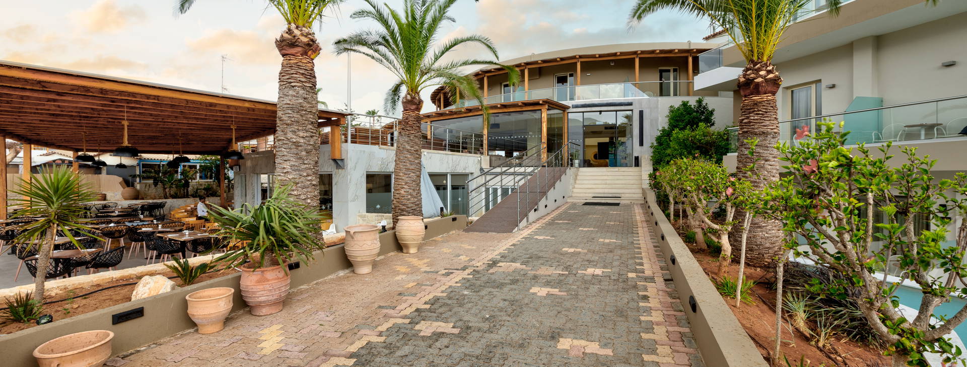 Bufet all inclusive. Snídaně (7:30 - 10:00), pozdní snídaně (10:00 - 10:30), oběd (12:30 - 14:30), večeře (18:30 - 21:30). Kulinářské ukázky u snídaně a oběda. Tematické večery (např. řecký, krétský, italský atd.). Hlavní bar (17:00 - 01:00) bar u bazénu (10:00 - 01:00). Nápoje po 23:00 podávané za příplatek. Denně: u bazénu se podává káva, alkoholické a nealkoholické nápoje, pivo, občerstvení a zákusky. Nápoje all inclusive: káva, čaj, dovážené pivo, bílé a červené víno, místní točené pivo, místní lihoviny a koktejly.