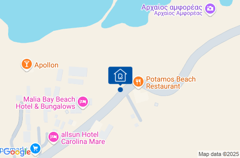 Malia Bay Hotel se nachází na severním pobřeží Kréty, v Potamosu, klidném východním předměstí města Malia. Centrum města Malia je vzdáleno 1,5 km, město Chersonissos 7 km a letiště 28 km. Hotel je postaven jen několik metrů od slavného minojského letního paláce.