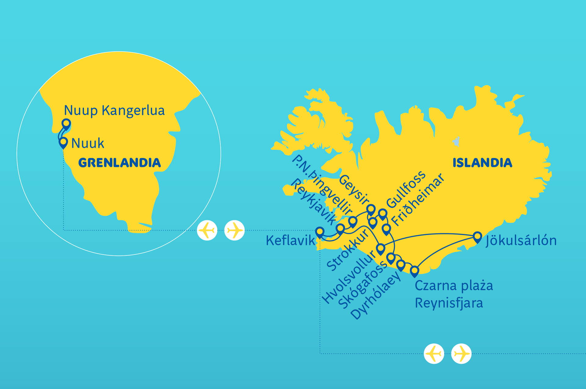 Reykjavík a Zlatý kruh • Þingvellir a gejzíry Geysir/Strokkur • Gullfoss a černé pláže Reynisfjara • ledovec Vatnajökull a laguna Jökulsárlón • Reykjavík a Modrá laguna • Nuuk a fjord Nuup Kangerlua • plavba mezi ledovcovými horami • rybářský výlet na Grónsku • procházka po Nuuku • velrybí safari (volitelně)