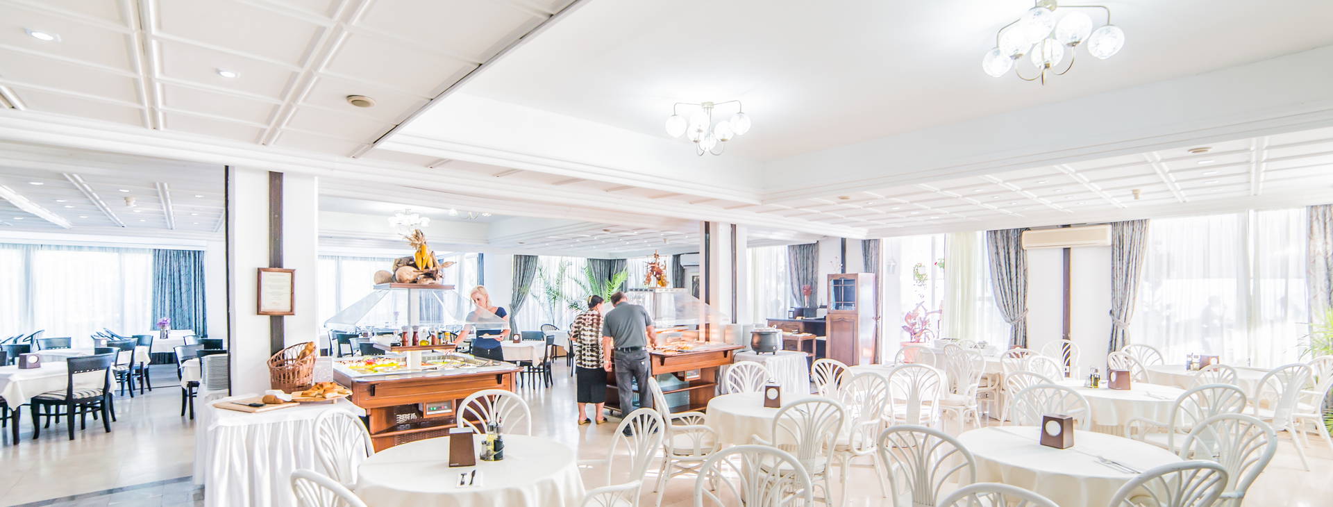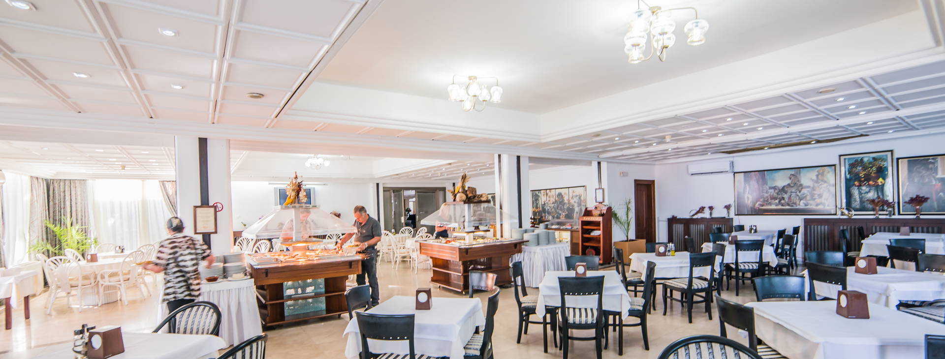 All inclusive: snídaně (08:00-10:30), oběd (12:00-14:00), večeře (18:00-20:30) (všechna jídla formou bufetu) ve 2 restauracích (v jedné je k dispozici pouze snídaně, v druhé oběd a večeře). Občerstvení (17:00-18:30) a zmrzlina (12:00-17:00). Místní alkoholické (pivo, víno, ouzo atd.) a nealkoholické nápoje (09:00-22:00).