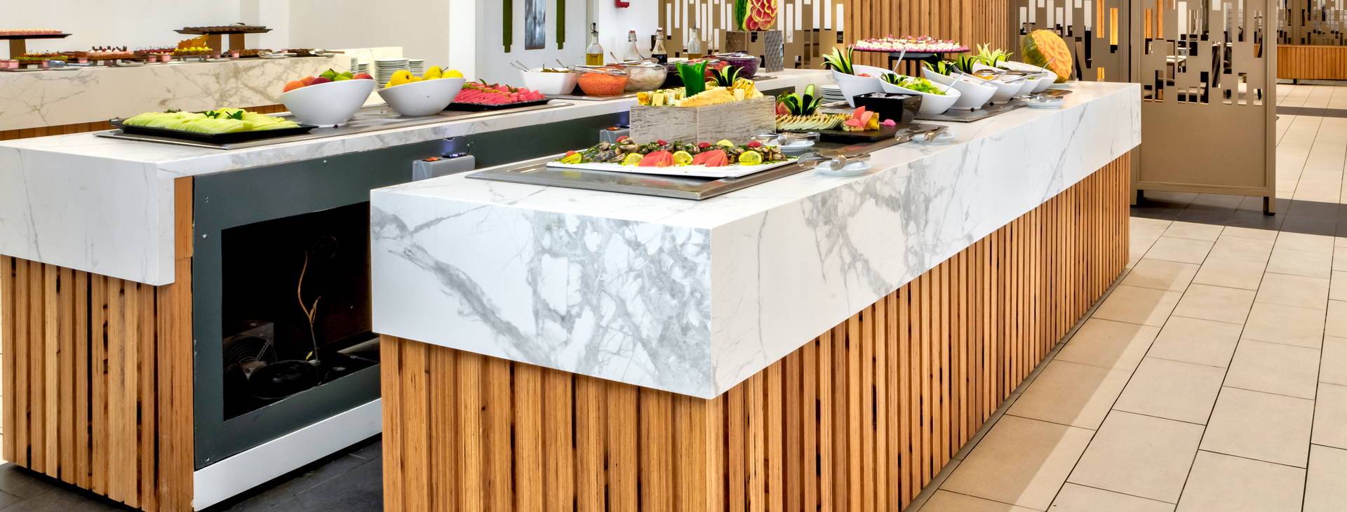 All inclusive: Snídaně 07:00–10:00, oběd 13:00–15:00, večeře 19:00–22:00 (bufet v hlavní restauraci Safran), snack bar Blanc 10:30–18:00, občerstvení ve vyhrazeném baru 10:30–12:00, 13:00–15:30, 16:00–18:00. Nealko nápoje a místní alkohol ve vyhrazených barech v čase 10:00–03:00.