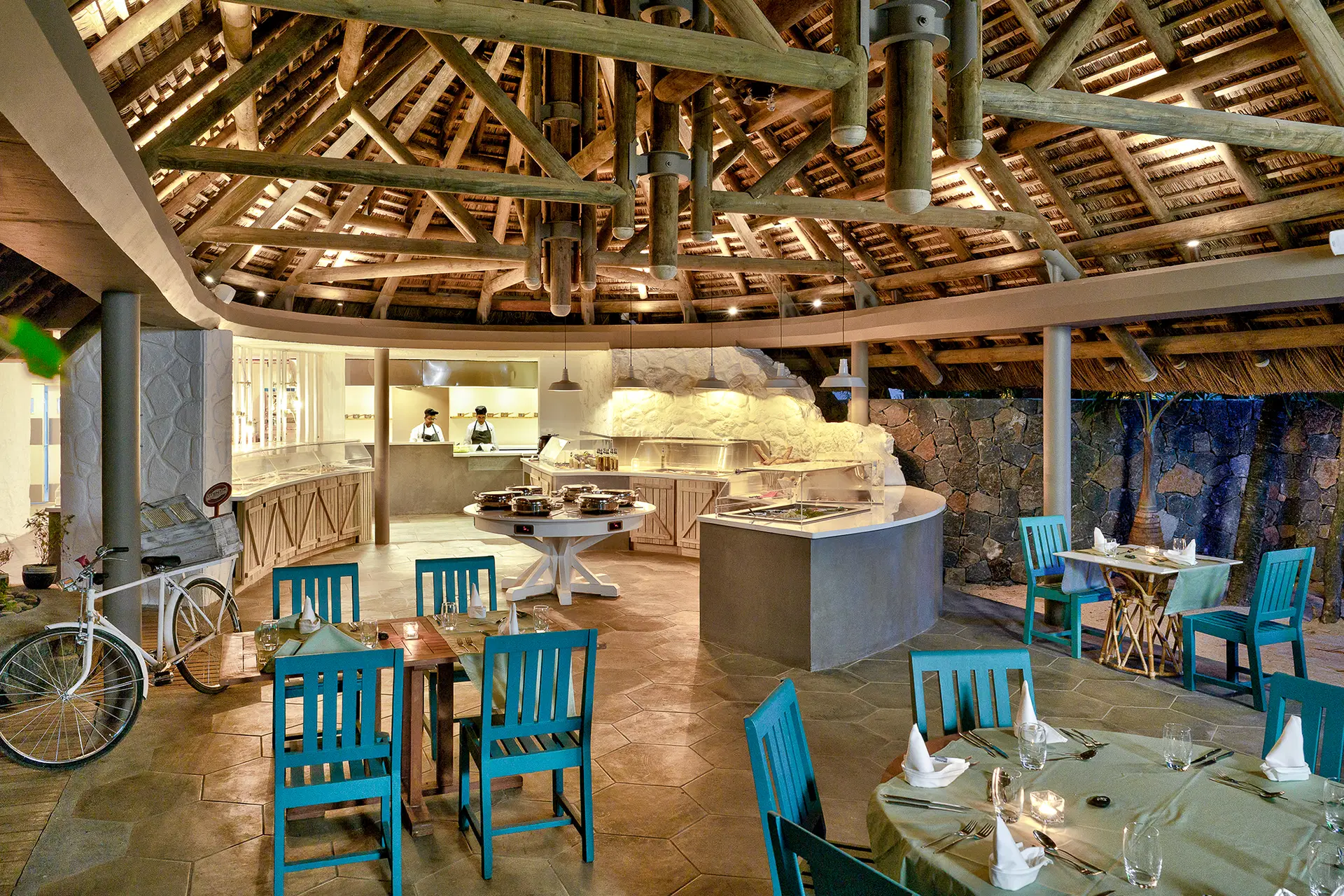 Snídaně (7:00-10:00) a večeře (19:00-22:00) se podávají v hlavní restauraci Le Cap formou bufetu (místní a mezinárodní kuchyně, živá kuchyně). Kromě toho si hoteloví hosté mohou vychutnat také večeři (19:00-22:00) v restauraci Kot Nou a'la carte (4x týdně po předchozí rezervaci). Nápoje k jídlu jsou za příplatek.