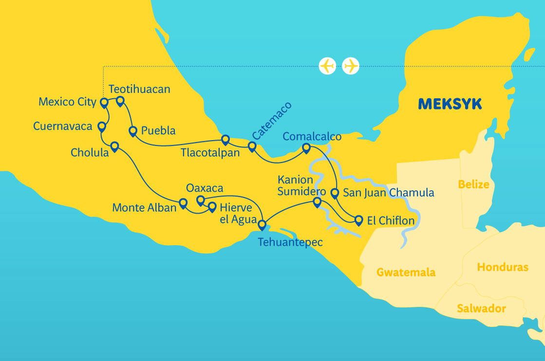 Mexico City a svatyně Panny Marie Guadalupské • Mayové - Aztékové a Zapotéci a jejich nejvýznamnější města - státy • tajemný Teotihuacán • tropy v Palenque • koloniální památky Puebla • přírodní rezervace a nezapomenutelné výhledy v oblasti Catemaco a kaňonu řeky Sumidero • jedinečné kouzlo San Cristóbalu a Oaxacy • Cuernavaca - město „věčného jara“ a známé lázně