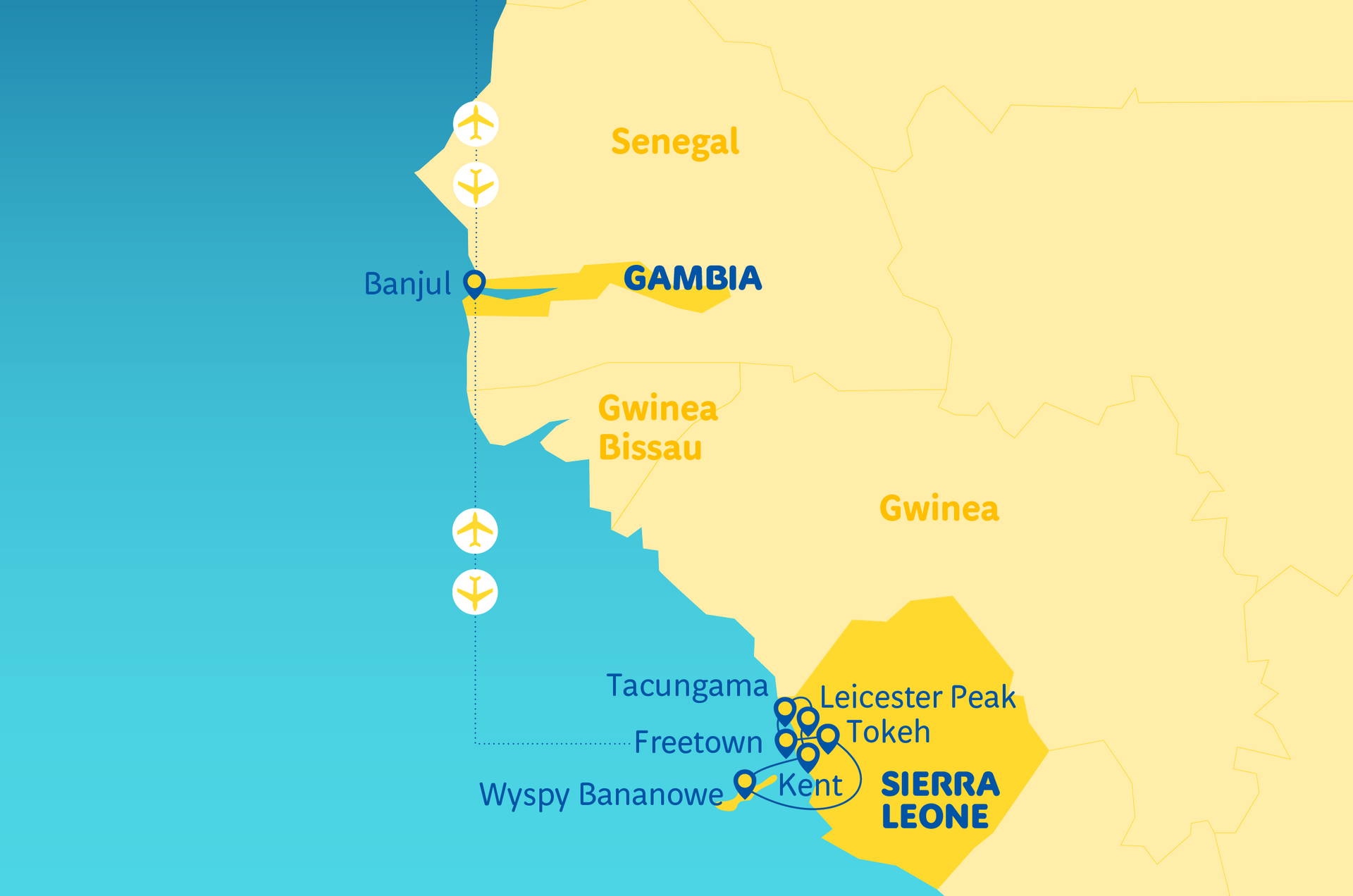 Základní cena zahrnuje: charterový let, ubytování dle popisu, 7 nebo 14 nocí, snídaně a večeře, trajektové přepravy, plavbu na Banánové ostrovy, vnitrostátní let, letištní transfery, přejezdy minibusem pro 18–20 osob (střešní nosič na zavazadla) s klimatizací, asistenci polského zástupce během odbavení na letišti v Polsku, polského průvodce – vedoucího skupiny během poznávání Gambie a Sierry Leone, místní průvodce, pojištění TU Europa - varianta základní (úrazové pojištění, léčebné výlohy a zavazadla).