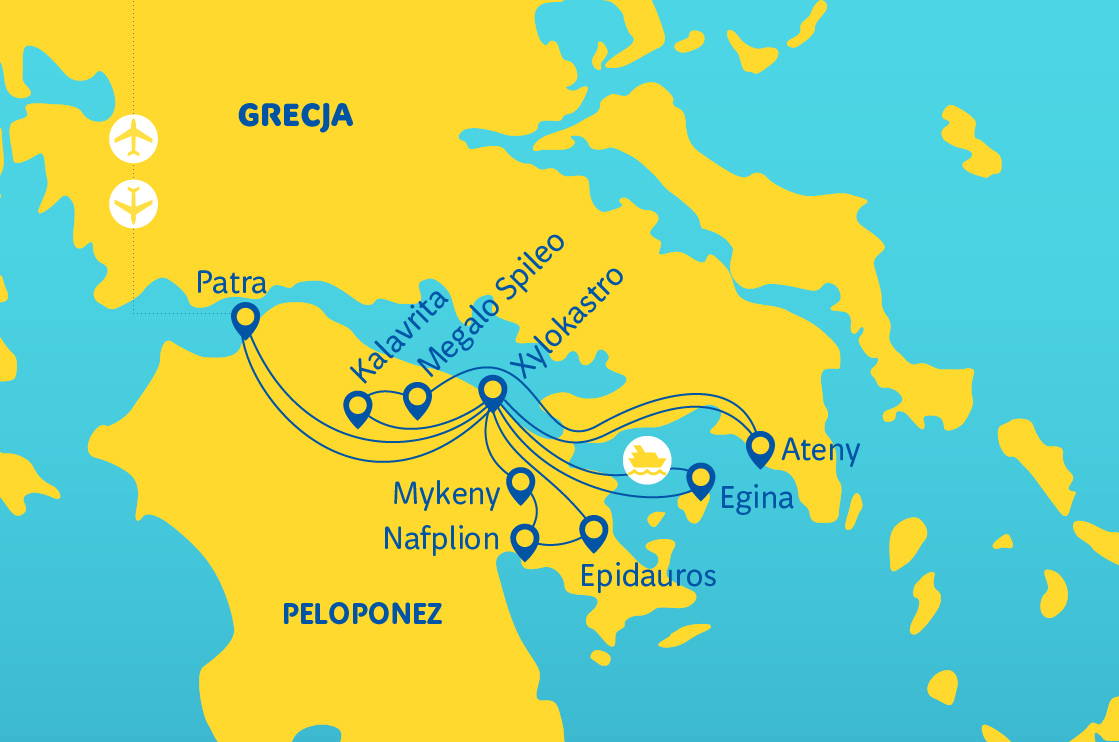 Atény - Akropolis a Lykavittos • Epidaurus, Mykény, Korint • Aigina - chrám bohyně Afaie a klášter sv. Egnatia • Diakopto - Kalavryta, Jeskyně jezer a Megalo Spilaio • pobyt v proslulých lázních - Loutraki