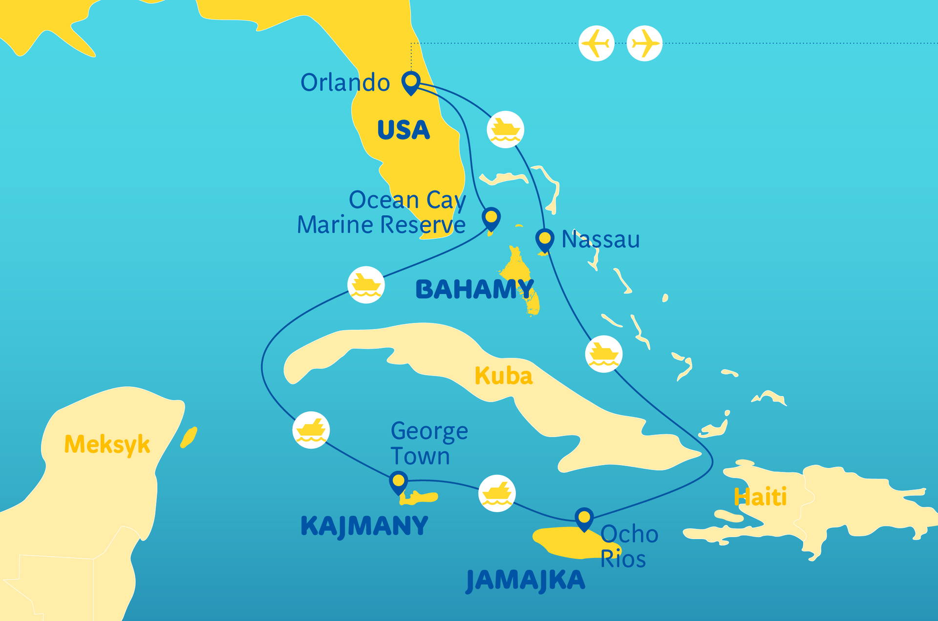 Miami – brána do Karibiku • Ocean Cay – soukromý ostrov MSC s krásnými plážemi a tyrkysovou vodou • Nassau – hlavní město Baham s historickým centrem • Falmouth na Jamajce – georgiánská architektura a tropické zahrady • George Town na Kajmanských ostrovech – bílé pláže a mořské gejzíry • Prohlídka Miami – Little Havana, South Beach a Wynwood Walls • Jízda amfibií Duck Boat