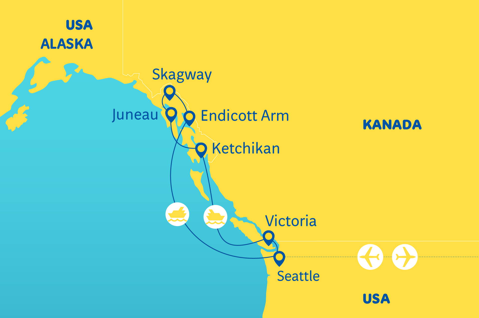 Seattle – brána na Aljašku • Endicott Arm – malebný fjord • Skagway – městečko z dob zlaté horečky • Juneau – hlavní město Aljašky • Mendenhall Glacier – ledovec na dosah ruky • Ketchikan – světové hlavní město lososů • Victoria – kouzelné hlavní město Britské Kolumbie