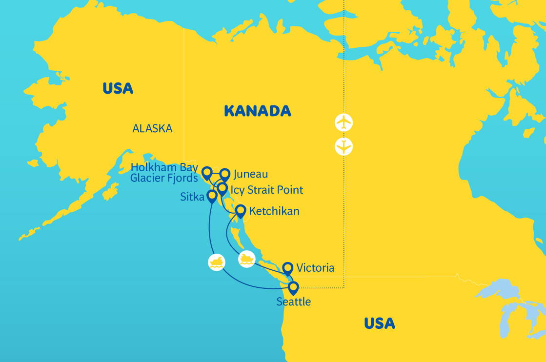 Seattle – brána na Aljašku • Juneau – hlavní město Aljašky • Holkham Bay Glacier Fjords – ledovec na dosah ruky • Ketchikan – světová metropole lososa • Victoria – půvabné hlavní město Britské Kolumbie • loď Norwegian Bliss** • v ceně: stravování – 3 jídla denně • polský průvodce na palubě lodi