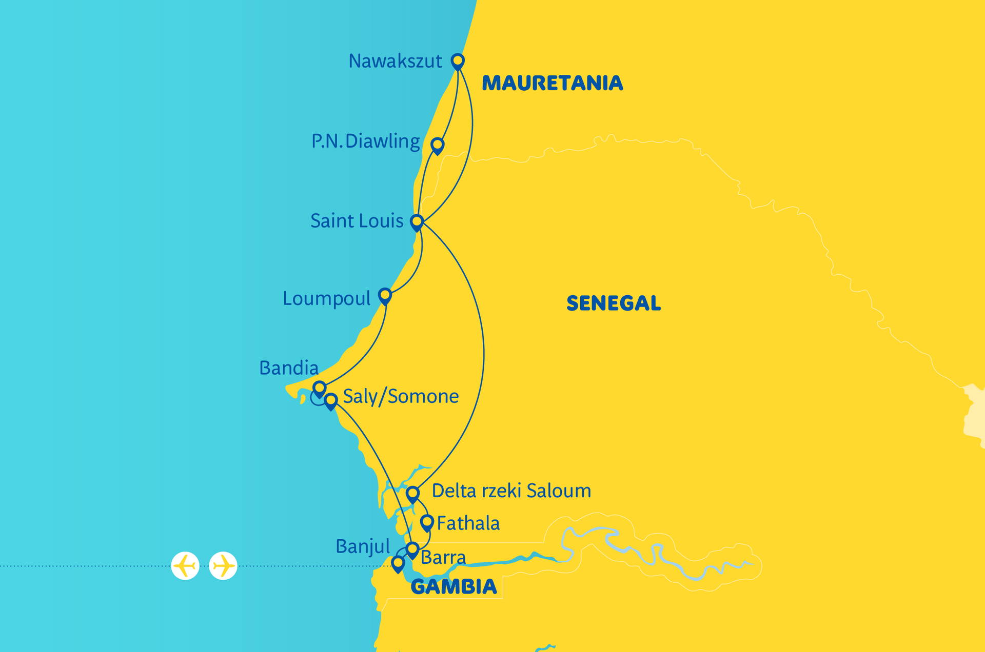 Brzy ráno po snídani odjezd severním směrem k bezbřehé saharské poušti. Před překročením senegalsko-mauritánské hranice navštívíme národní park Djoudj, který je zapsán na seznamu světového dědictví UNESCO, je zelenou oázou tvořenou stovkami kilometrů částečně zaplavené půdy. Tento "mokrý ráj" je nejlepším prostředím a hnízdištěm pro více než milion stěhovavých i usedlých ptáků. Chráněné mokřadní prostředí, zcela obklopené suchou krajinou, přitahuje více než 400 druhů, které v této jedinečné ptačí rezervaci dočasně žijí. Užijeme si výlet lodí na ostrov s úžasnou koncentrací pelikánů. Přirozenou hranici mezi Mauritánií a Senegalem tvoří řeka Senegal, která je zároveň přirozenou hranicí mezi pouští a savanou. Řeku překročíme po pohyblivém mostě a přesuneme se do jedinečných mokřadů mezi Saharou a Sahelem v poušti Ferlo. Přejezd do hotelu, večeře.