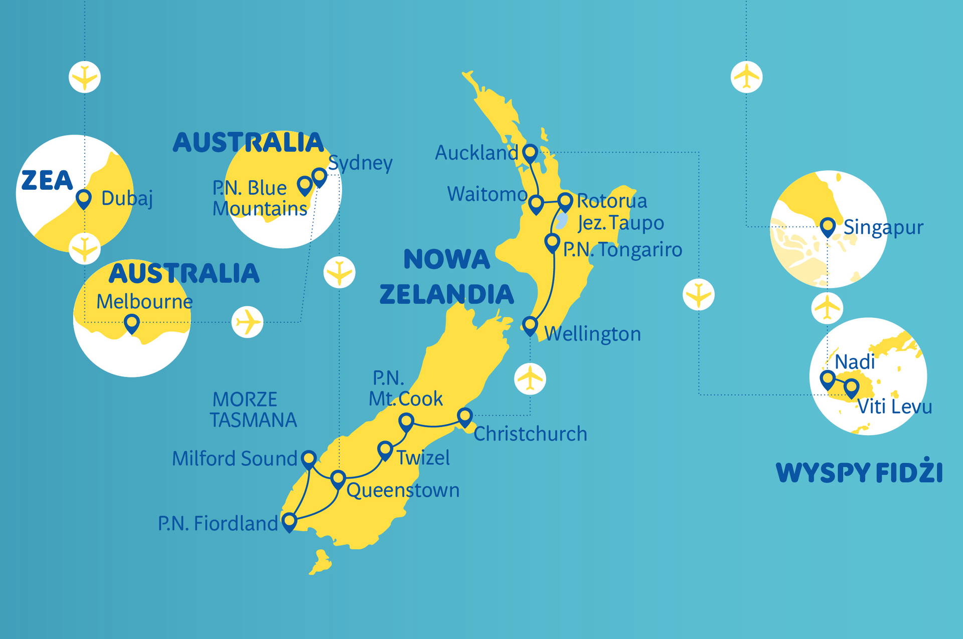 Cena zahrnuje: Plavba letadlem z Varšavy do Austrálie a z Nového Zélandu do Varšavy s mezipřistáním: Varšava - Dubaj (nocleh a prohlídka) - Melbourne a Singapur (nocleh a prohlídka) - Dubaj (mezipřistání) - Varšava; vnitřní lety:(s mezipřistáním): Melbourne - Sydney - Queenstown, Christchurch - Wellington, Auckland - Nadi - Singapur; letištní poplatky, transfery klimatizovaným autobusem (dle programu), ubytování 18 započatých nocí v hotelu dle programu, snídaně, služby polského zástupce při odbavení na letišti ve Varšavě, péče polsky mluvícího pilota nebo polsky mluvícího zástupce místního dodavatele. během zájezdu turistický program, viz. níže, pojištění TU Europa varianta základní (úrazové pojištění a léčebné výlohy, trvalé následky, asistenční služby a pojištění zavazadel).