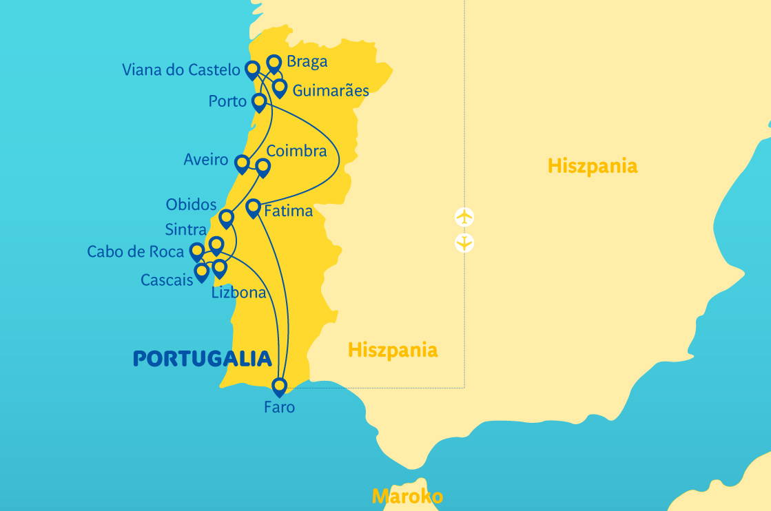 • Lisabon • romantická Sintra a tajemný Palác Regaleira • Cabo da Roca – konec Evropy • stylové Cascais • historický Lisabon s oceanáriem Expo ’98 • středověké Obidos a univerzitní Coimbra • barevné kanály Aveira – portugalská Benátky • Viana do Castelo a Guimarães – kolébka Portugalska • duchovní Braga a Fatima • chutné Porto s plavbou po řece Douro • pro zájemce možnost dalšího týdne odpočinku na Algarve nebo Costa de la Luz.