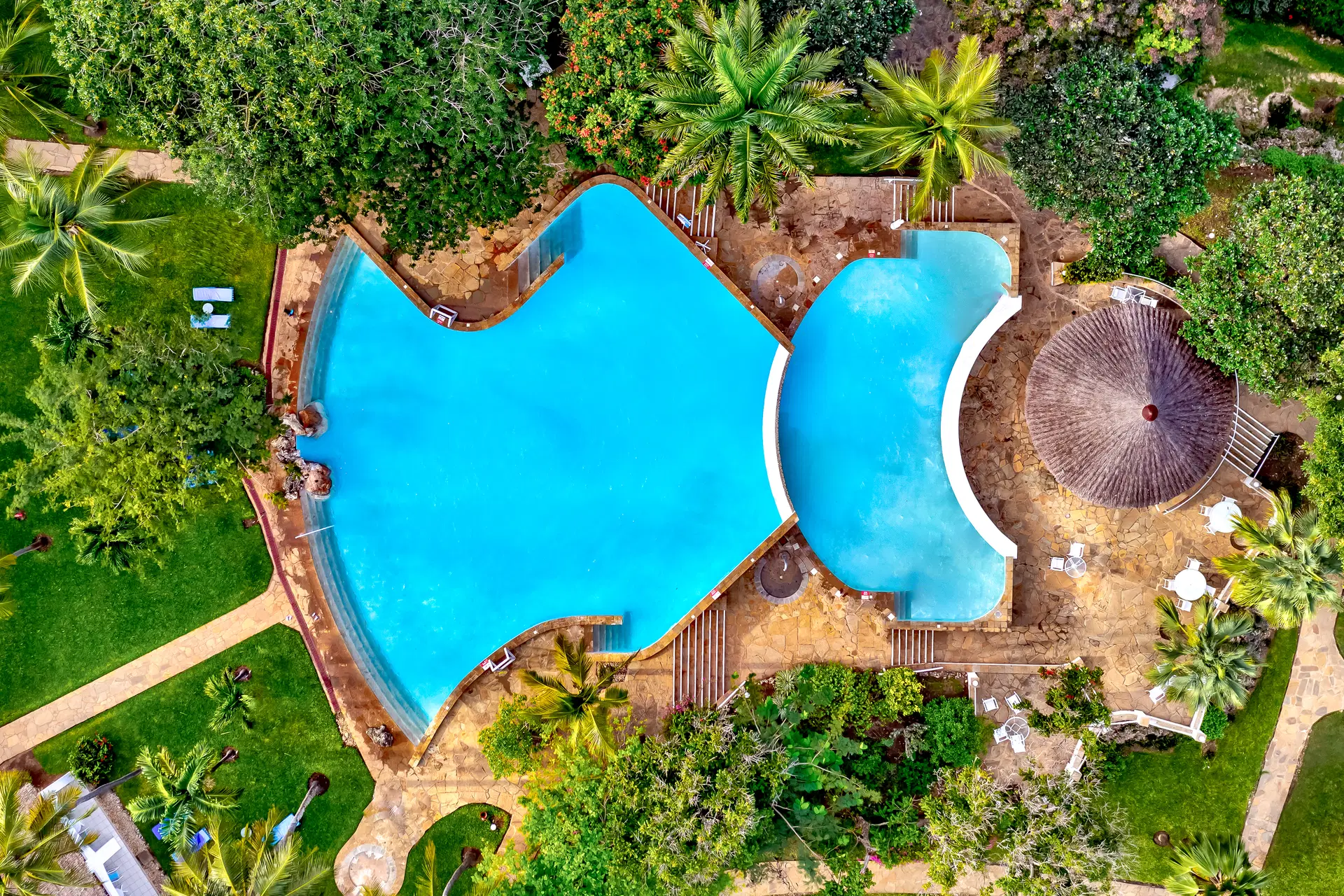 Recepce 24 h, prostorná vstupní hala. Restaurace: hlavní u pláže, a'la carte Katika Ziwa, kde se podávají především mořské plody (za poplatek), 2 bary: hlavní u recepce (09:00-24:00), u bazénu Galana (09:00-18:00) a kavárna (káva a čaj od 17:30-18:30). 3 bazény: jeden se sladkou vodou spojený s vířivkou, druhý se slanou vodou u lázeňského centra a třetí s lehátky umístěný u pokojových bungalovů. Dále: trezor na recepci, butik, obchody se suvenýry a šperky.