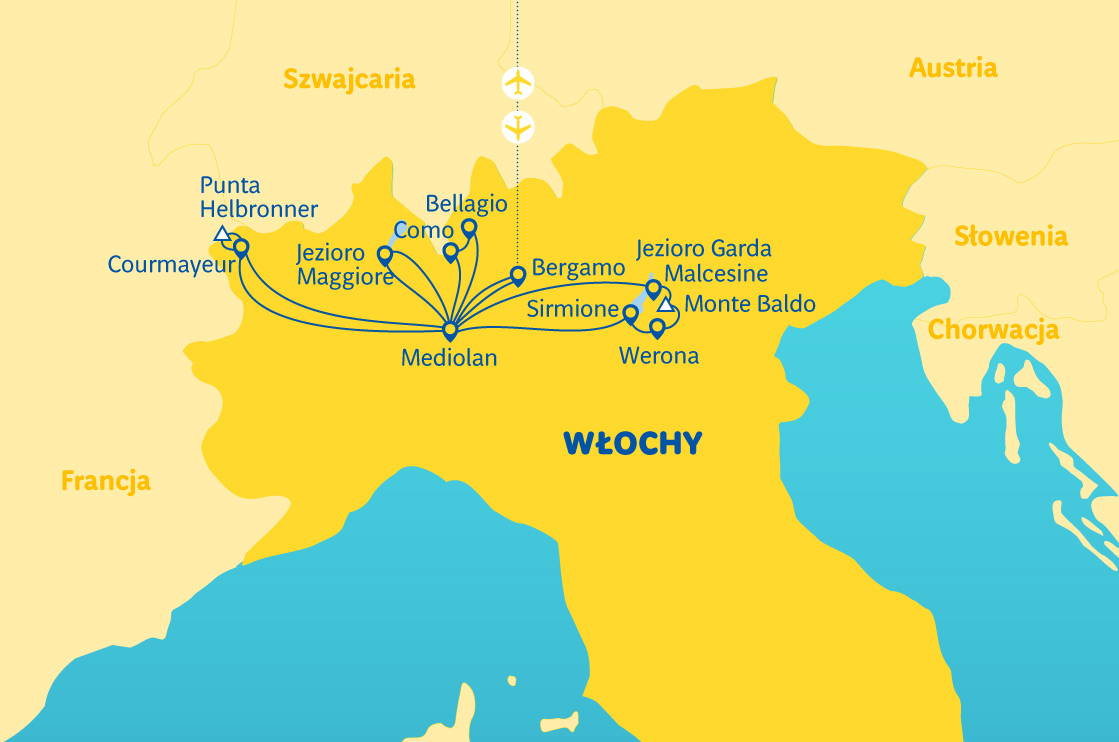Miláno - síla dynastie Sforzů • Garda a Dolomity - předzvěst Alp • jezero Lago di Garda a Sirmione - okouzlující zákoutí • jezero Lago Maggiore a Borromejské ostrovy • Mont Blanc - (italsky Monte Bianco) nejvyšší vrchol Evropy • Verona a Monte Baldo - fantastická příroda a překvapivá historie • Como - Bellaggio - zázraky přírody!