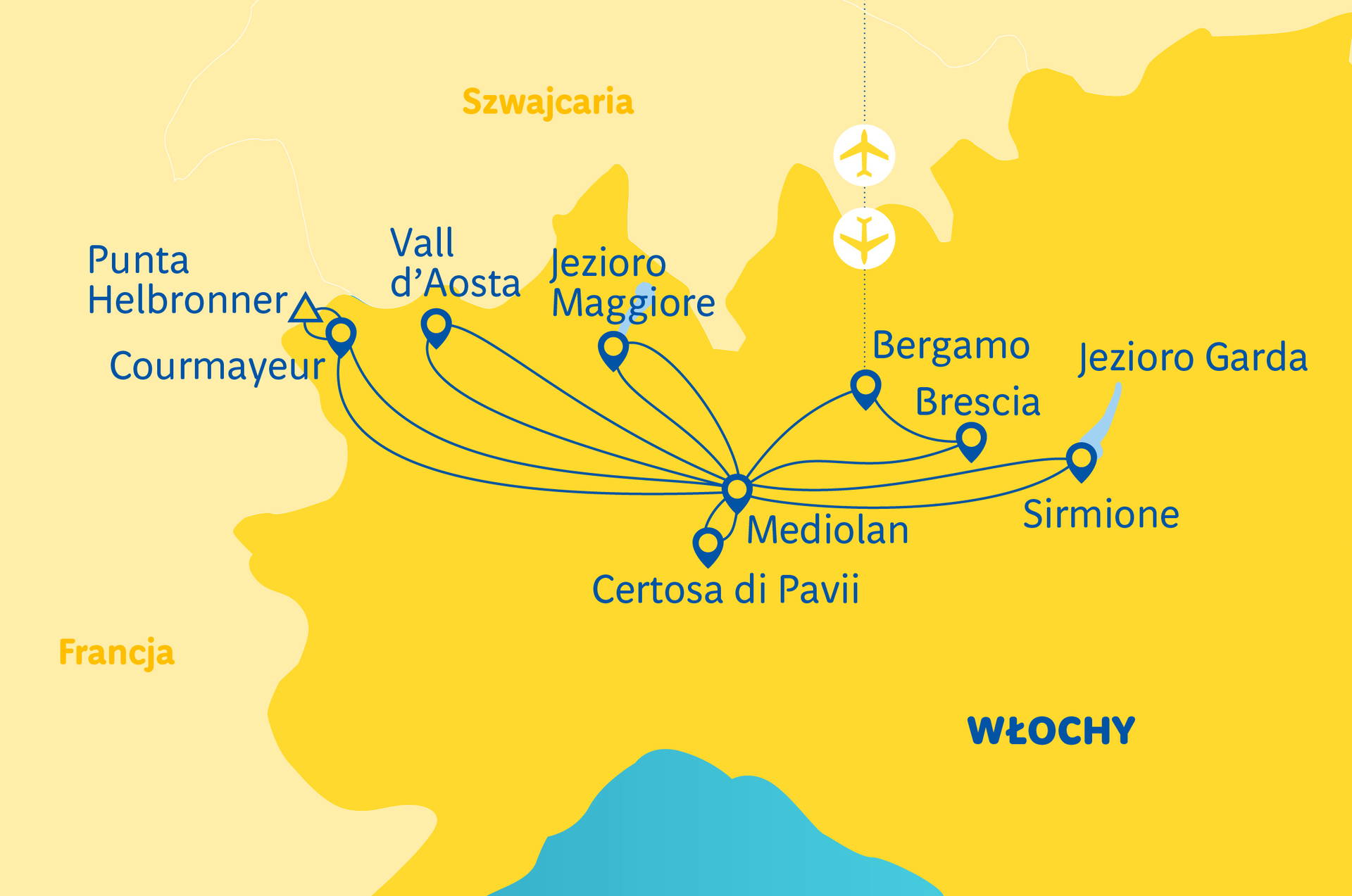 Miláno - síla dynastie Sforzů • Garda a Dolomity - předzvěst Alp • jezero Lago di Garda a Sirmione - okouzlující zákoutí • jezero Lago Maggiore a Borromejské ostrovy • Mont Blanc - (italsky Monte Bianco) nejvyšší vrchol Evropy • Verona a Monte Baldo - fantastická příroda a překvapivá historie • Como - Bellaggio - zázraky přírody!