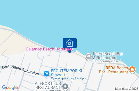 Hotel Calamos Beach se nachází na vynikajícím místě, odkud je pohodlný přístup k různým atrakcím, např. k zábavnímu parku a archeologickému muzeu v Marathonu. Nachází se asi 2 km od centra malebné vesničky Agioi Apostoloi, kde na vás dýchne místní řecká atmosféra. Přibližně 200 m od hotelu se nacházejí místní restaurace, bary a obchody. Vzdálenost od aténského letiště je přibližně 70 km. Přístav Oropos, který zajišťuje spojení s ostrovem Evia, je vzdálen přibližně 15 km.